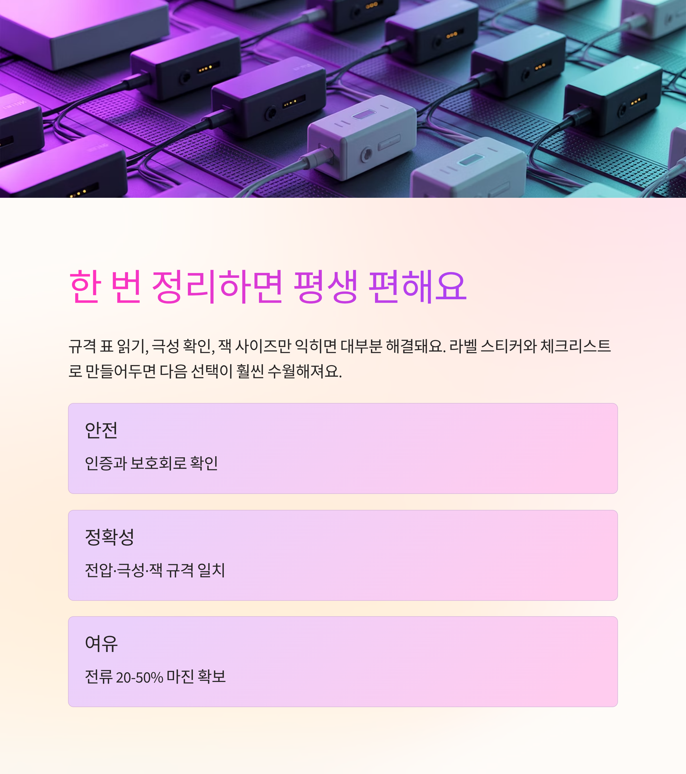 전원은 눈에 잘 안 보이지만 체감에 제일 먼저 영향을 줘요. 한 번 정리해두면 연결 실수가 줄고, 장치들도 조용히 제 역할을 하더라고요. 규격 표 읽는 법, 극성 확인, 잭 사이즈만 익혀도 대부분의 상황이 술술 풀려요. 오늘 정리한 기준을 라벨 스티커와 체크리스트로 만들어 두면, 다음에 전원 어댑터를 고를 때도 망설임이 훨씬 줄어들 거예요. 결국 안전과 편의는 같은 편에 있어요.