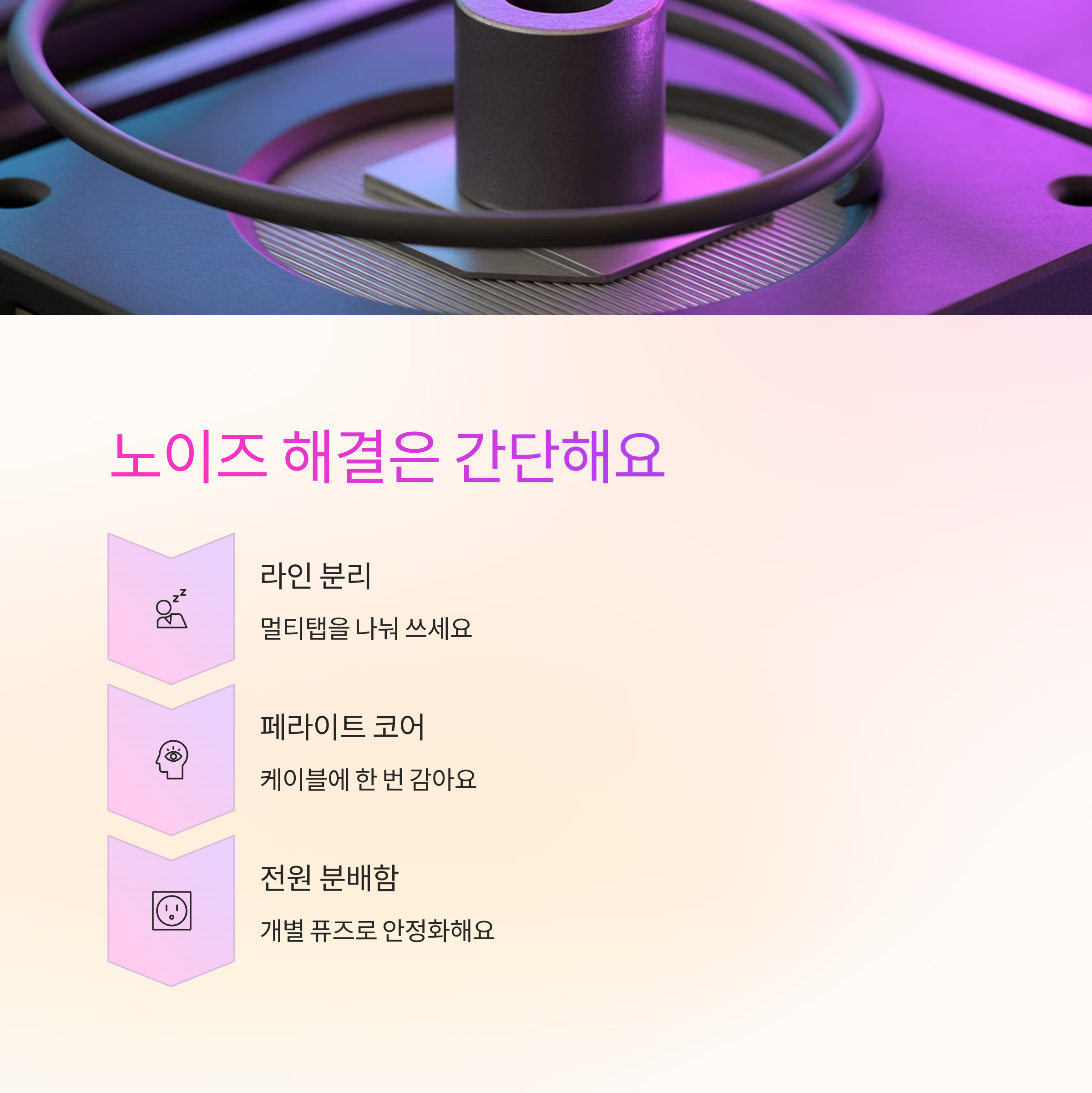 오디오 노이즈나 카메라 깜빡임이 생기면 전원 노이즈를 의심해요. 같은 회선에 모터류가 있거나, 어댑터 스위칭 주파수가 민감한 기기와 충돌할 수 있어요. 멀티탭 라인을 분리하거나 페라이트 코어를 한 번 감아도 효과가 있어요.