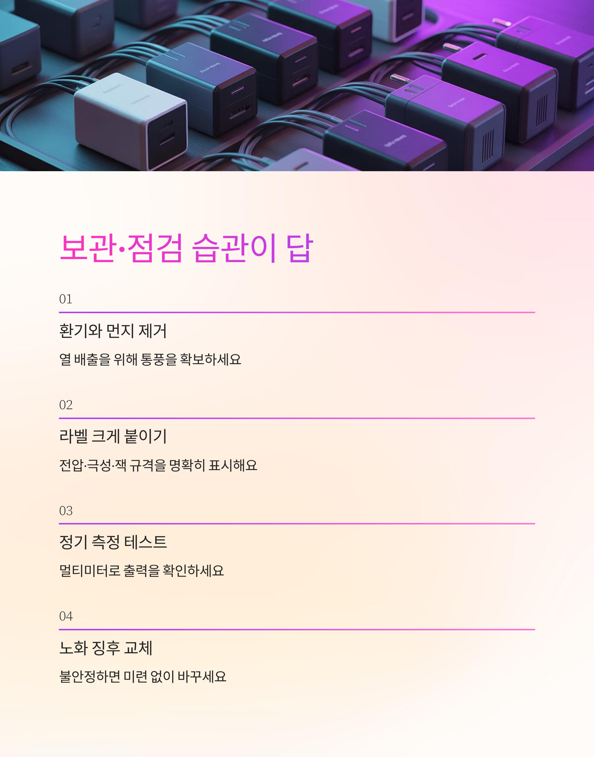 오래된 어댑터는 전해콘덴서가 노화돼 출력이 흔들릴 수 있어요. 불안정 징후가 보이면 미련 없이 교체하고, 폐기는 분리배출 규정을 따르는 게 좋아요.