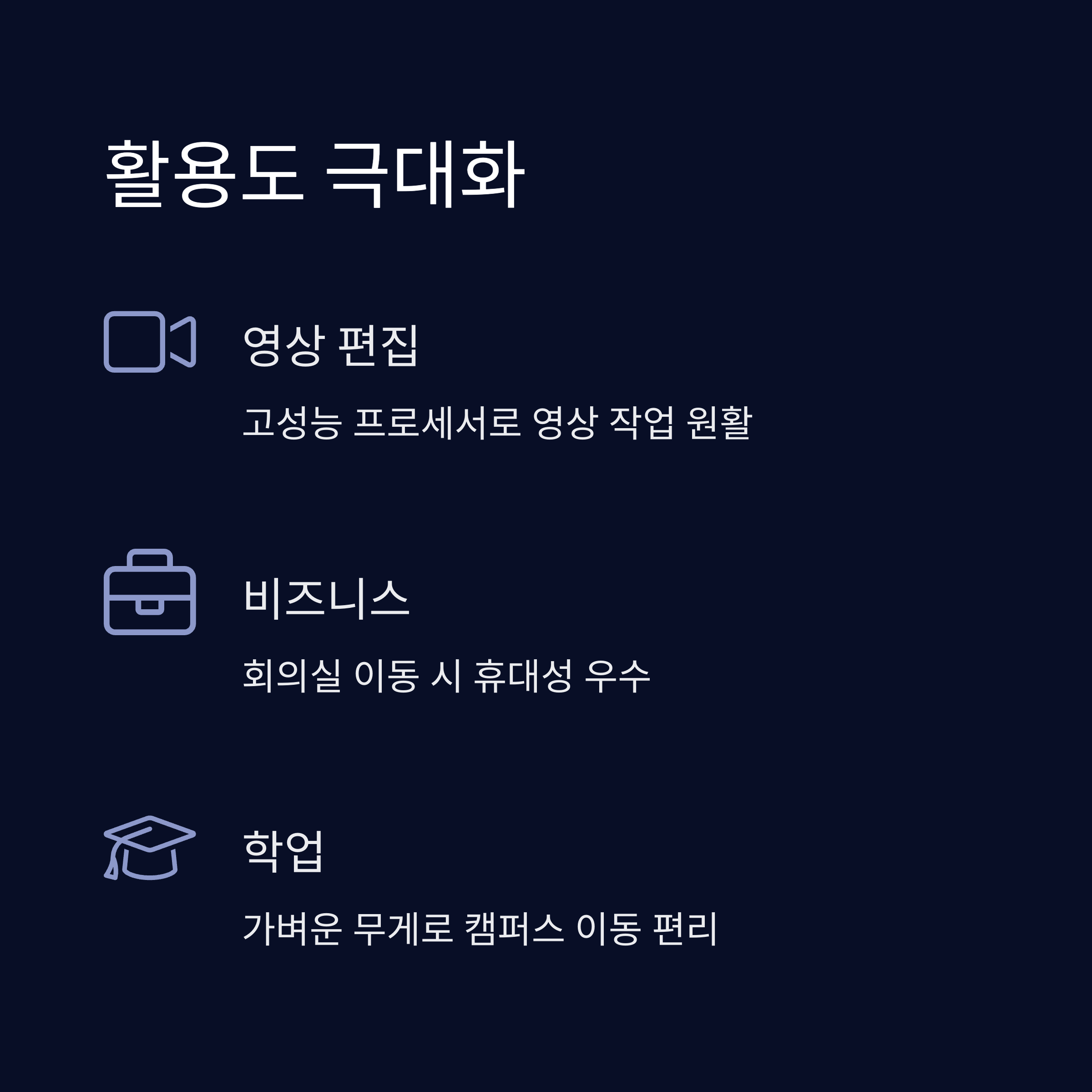 휴대성과 성능을 동시에 고려해야 하는 환경에서는 좋은 밸런스를 보여줘요. 예를 들어 회의실을 오가며 실시간 프레젠테이션을 해야 하거나, 카페나 외부에서도 작업을 이어가야 하는 프리랜서 분들에게도 적합하죠.