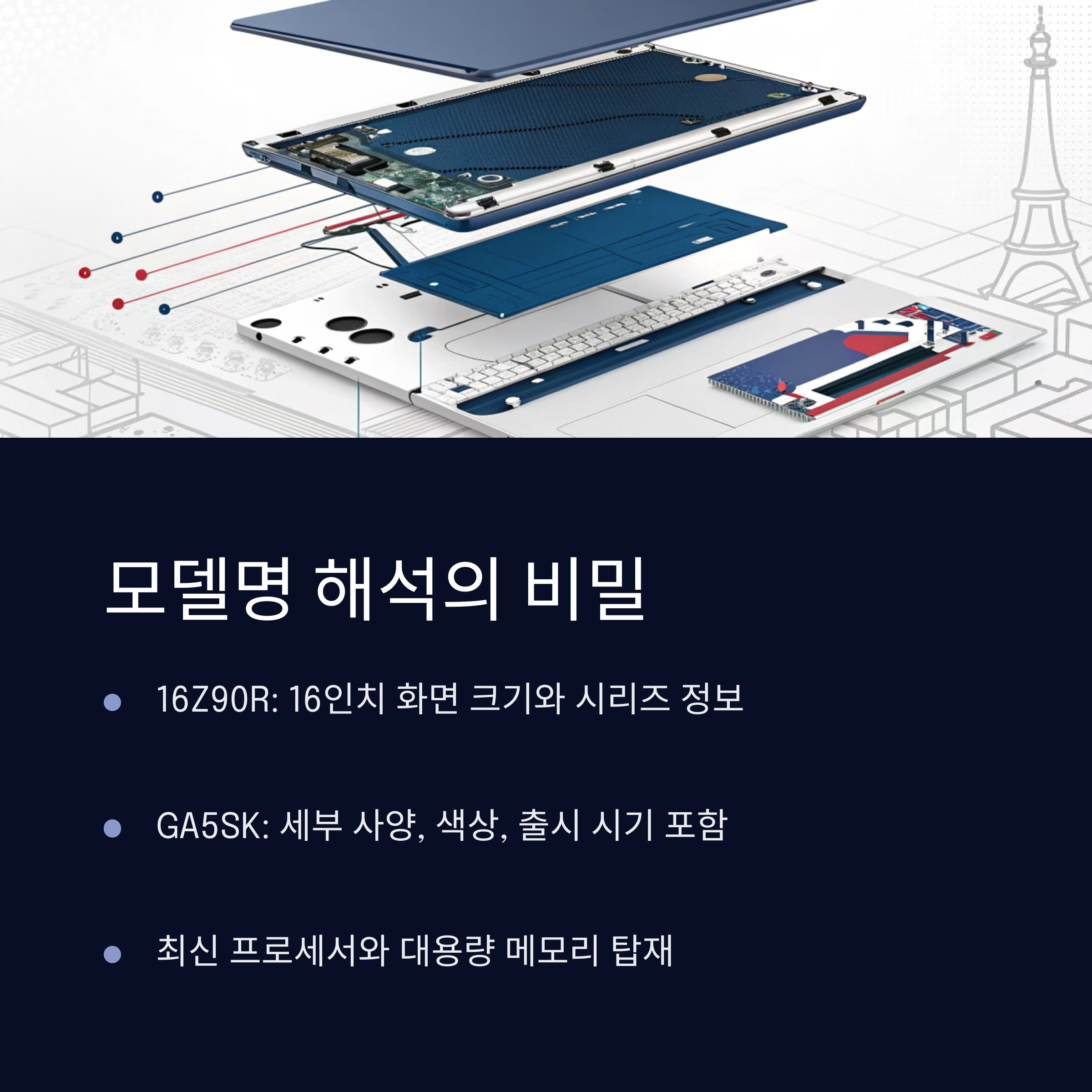 16Z90R-GA5SK는 숫자와 영문자가 결합된 제품명인데요, 이를 하나하나 뜯어보면 꽤 많은 걸 알 수 있어요. 예를 들어 앞자리 숫자는 화면 크기를 의미하고, 알파벳 조합은 해당 라인업과 세부 사양, 색상, 출시 시기를 나타내죠. 이런 구조는 처음엔 헷갈릴 수 있지만 익숙해지면 제품을 비교하거나 선택할 때 아주 유용해요.