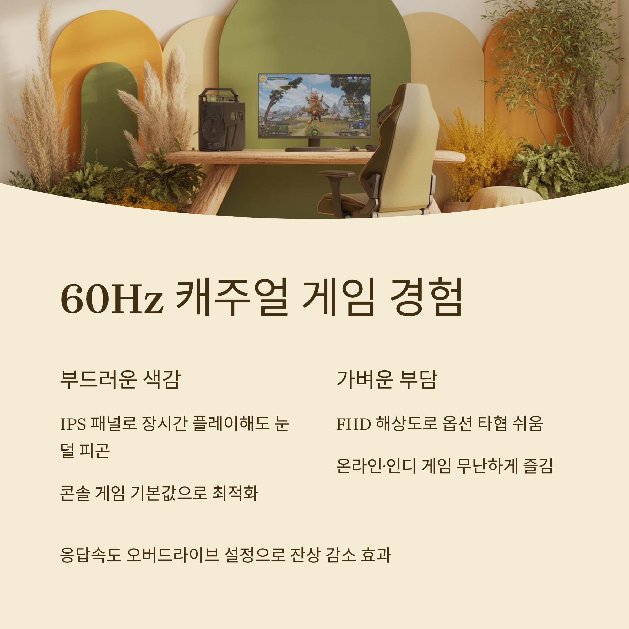 요즘 144Hz 이상 고주사율 모니터가 많이 보이지만, 모든 게임을 경쟁전 수준으로 즐기는 건 아니라서 60Hz FHD도 여전히 의미가 있어요. 캐주얼 온라인 게임이나 스토리 위주 싱글 게임은 프레임보다 화면 색감과 밝기가 더 크게 느껴질 때가 많거든요. 이 급 IPS 패널은 색 표현이 부드러워서, 과하지 않은 선명함으로 장시간 플레이해도 눈이 덜 피곤한 편이에요. 특히 콘솔 게임을 겸하는 분들에게는 FHD 60Hz 조합이 아직도 기본값처럼 쓰여요.
