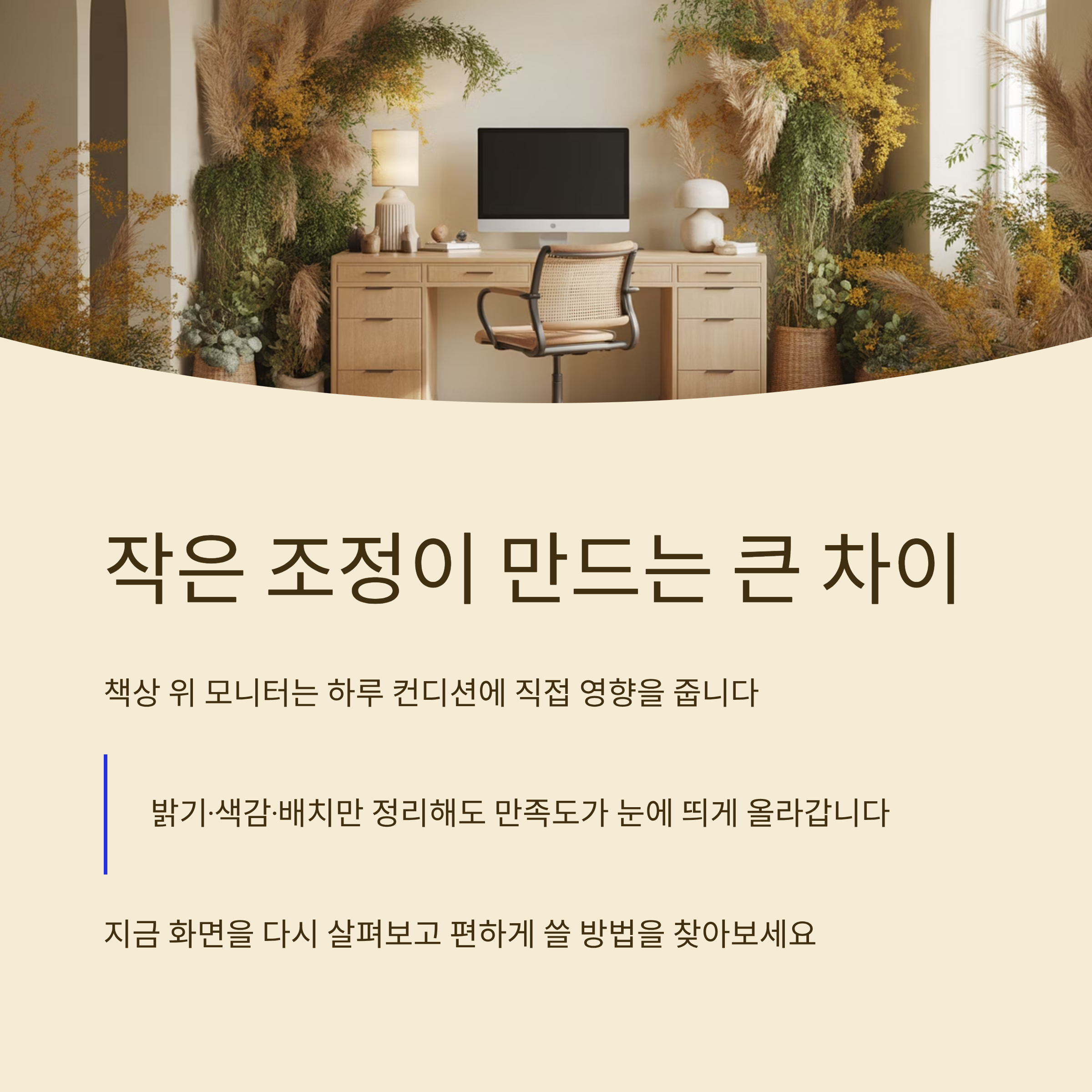 책상 위에서 제일 오랫동안 눈을 마주치는 장비가 모니터다 보니, 작은 차이도 하루 전체 컨디션에 꽤 크게 영향을 주는 것 같아요. 새 제품을 들이는 것도 좋지만, 지금 쓰고 있는 화면의 밝기와 색감, 배치만 한 번 정리해 줘도 만족도가 눈에 띄게 올라가더라고요. 오늘 이야기들이 여러분이 가지고 있는 모니터를 다시 한 번 살펴보고, 당장 바꾸기보다 어떻게 더 편하게 쓸 수 있을지 천천히 고민해 보는 계기가 되었으면 해요. 그렇게 기준이 한 번 잡히고 나면, 언젠가 새 모니터를 고를 때도 훨씬 덜 흔들릴 거예요.
