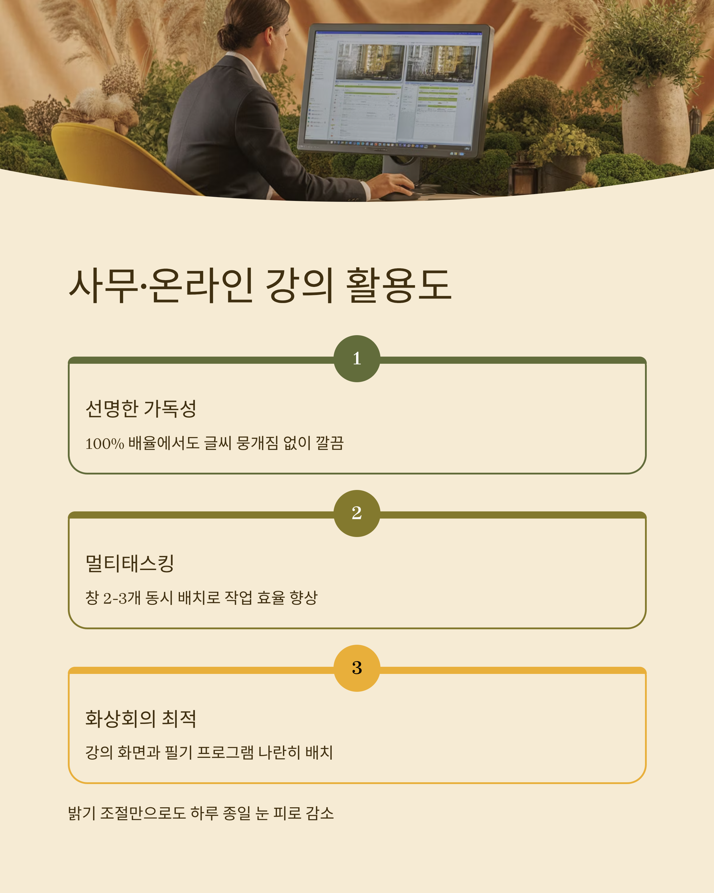 온라인 강의나 화상 회의를 볼 때도 24인치 FHD는 꽤 현실적인 선택이에요. 강의 화면과 필기 프로그램을 나란히 배치해 놓고 쓰기 좋고, 카메라 창과 채팅창까지 한 화면에 정리해두기에도 딱 알맞은 크기거든요. 밝기를 너무 높게 쓰지 않고, 주변 조명과 맞춰서 단계만 조절해줘도 눈이 훨씬 편해져요. 저녁 시간에는 약간 어둡게, 낮에는 한두 단계 밝게 쓰는 습관만 들여도 하루 전체 피로도가 달라져요.