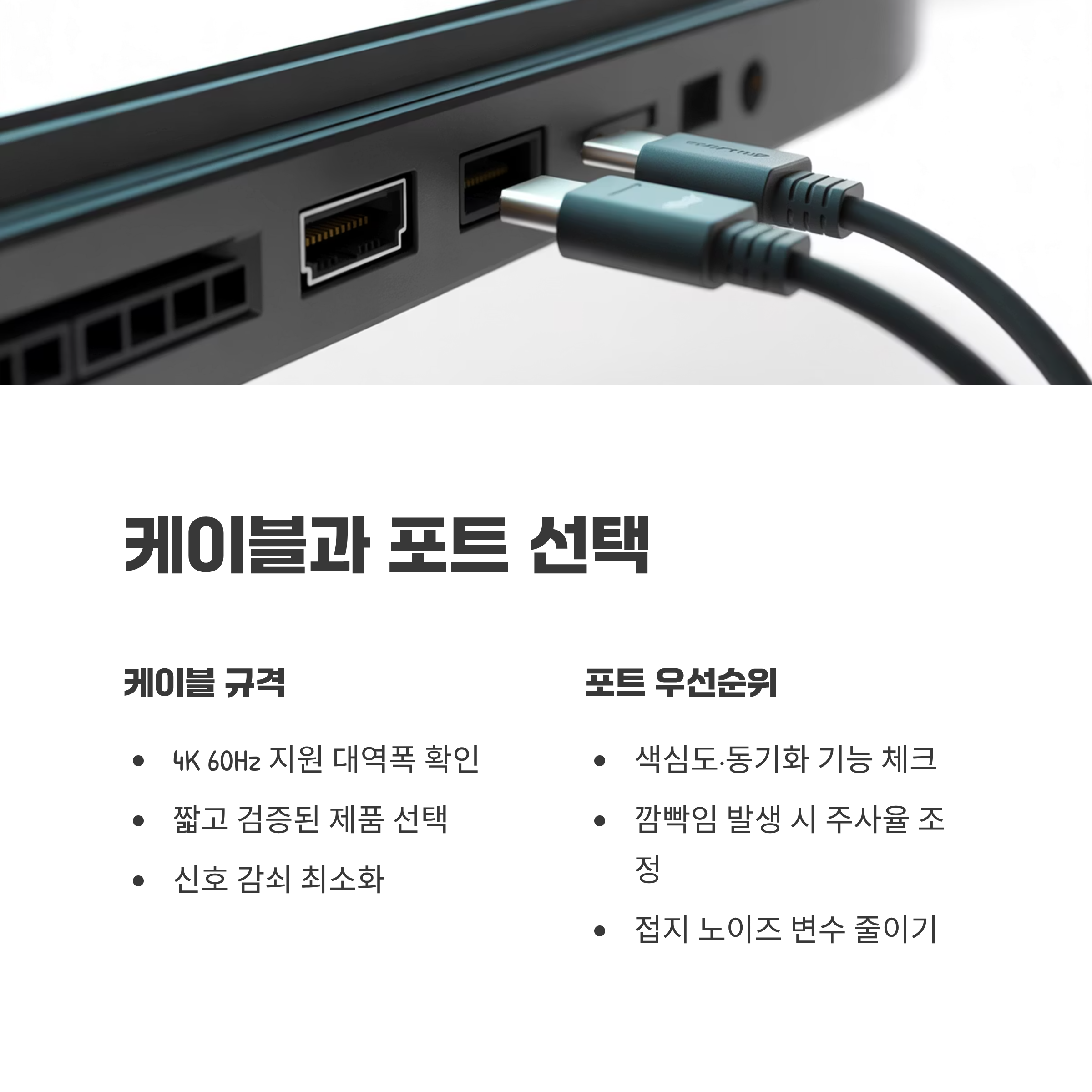 4K 60Hz를 안정적으로 쓰려면 케이블 규격을 먼저 확인해요. 오래된 케이블은 대역폭이 부족해 깜빡임이나 화면 꺼짐이 생길 수 있어요. 길이가 길수록 신호 감쇠가 커지니, 가능하면 짧고 검증된 케이블을 쓰는 게 좋아요. 노트북은 호스트 포트의 버전 제약도 체크해요.
