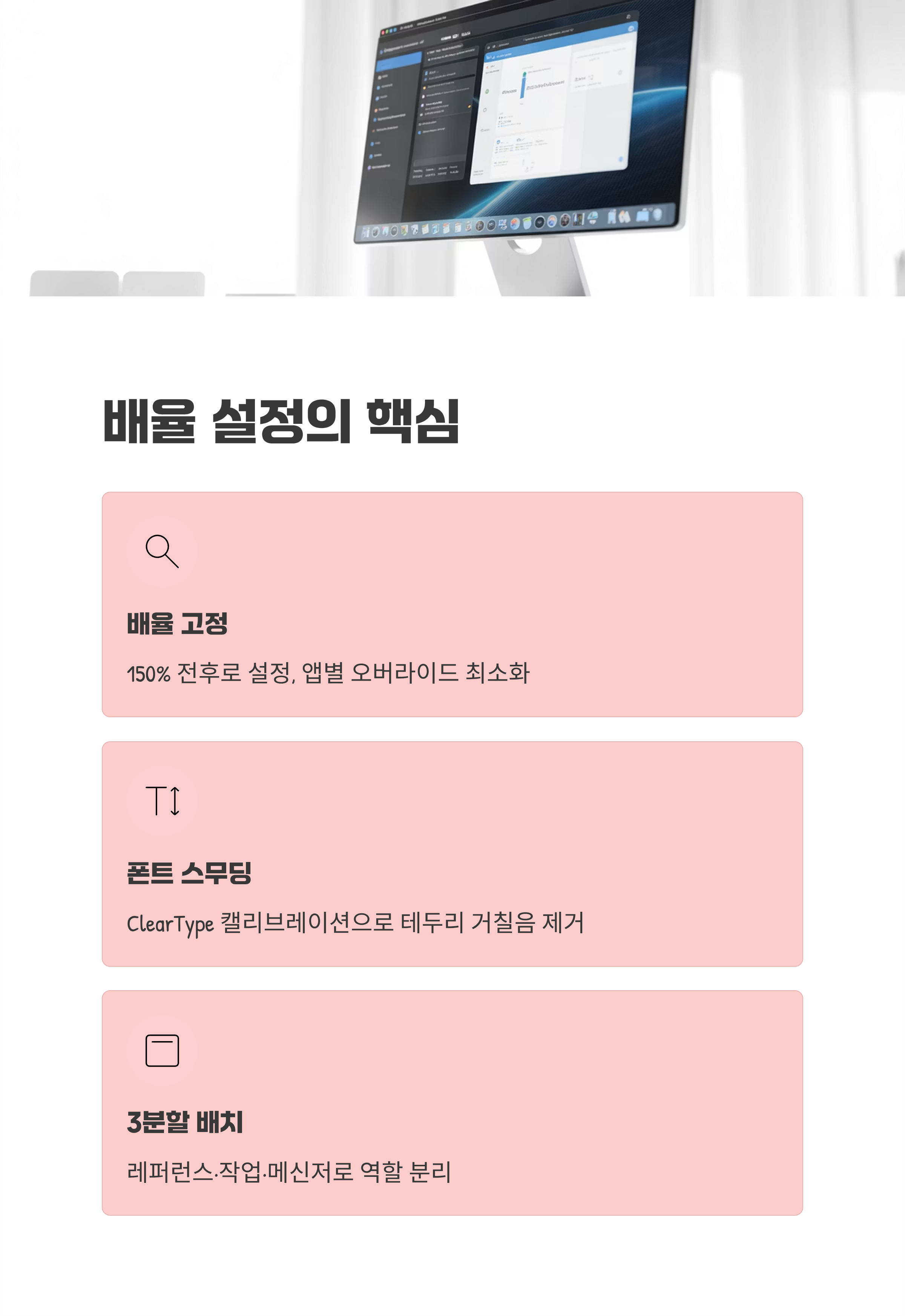 A. 기본 배율을 하나로 고정하고, 앱별 확대는 최소화하세요. 150% 전후에서 가독성이 무난해요.