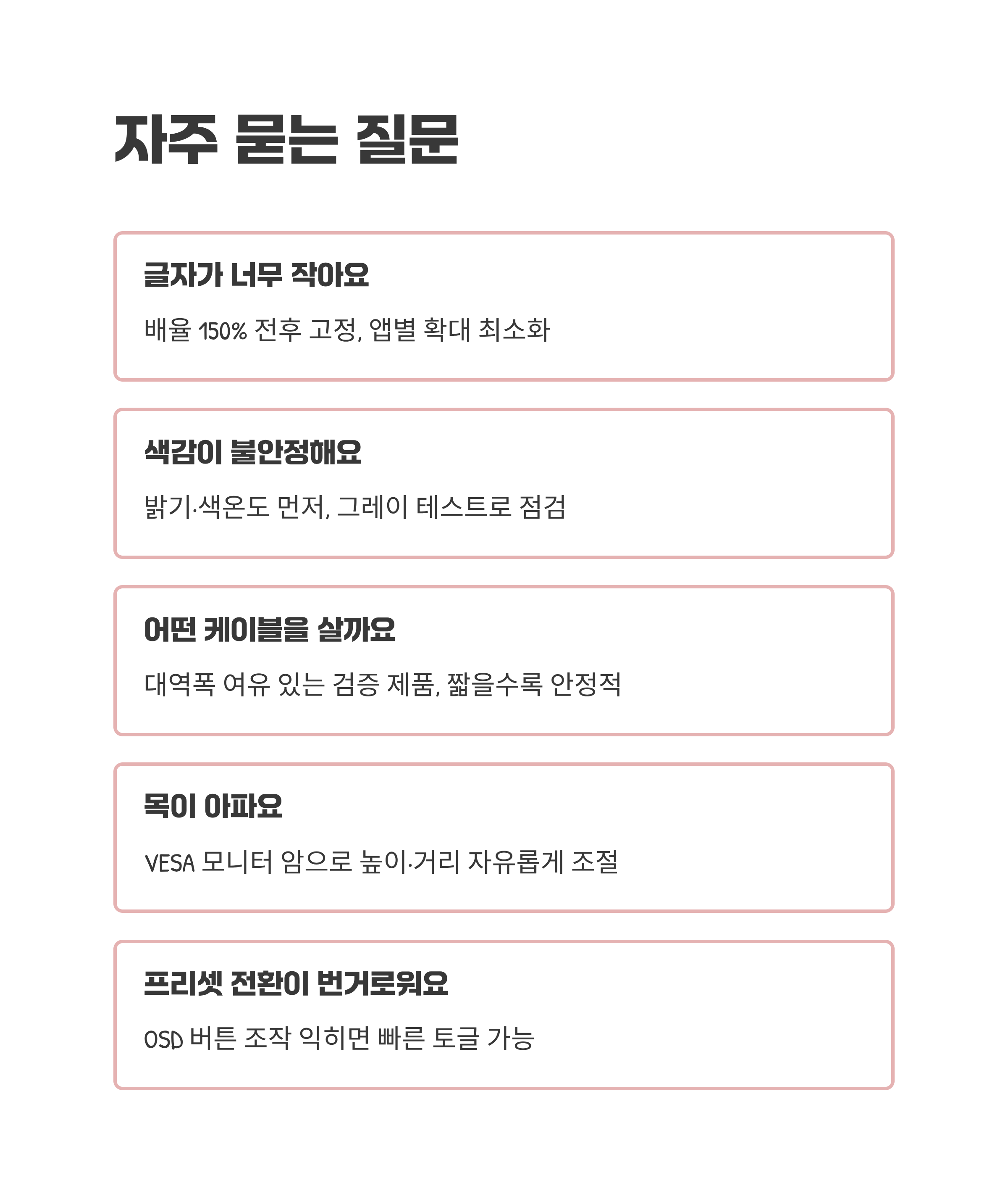 선명한 화면은 집중을 오래 붙잡아줘요. 배율과 색감, 자리만 잘 맞추면 업무도 여유롭고, 영화나 게임도 더 몰입돼요. 처음엔 옵션이 많아 복잡해 보여도, 내 환경에 맞는 두세 가지 프리셋만 만들어두면 매일이 간단해져요. 손에 익은 조작과 편한 배치가 쌓이면, 모니터는 배경으로 사라지고 콘텐츠만 남아요. 그 순간부터 화면은 더 이상 장비가 아니라, 하루를 편하게 해주는 풍경이 되더라고요.