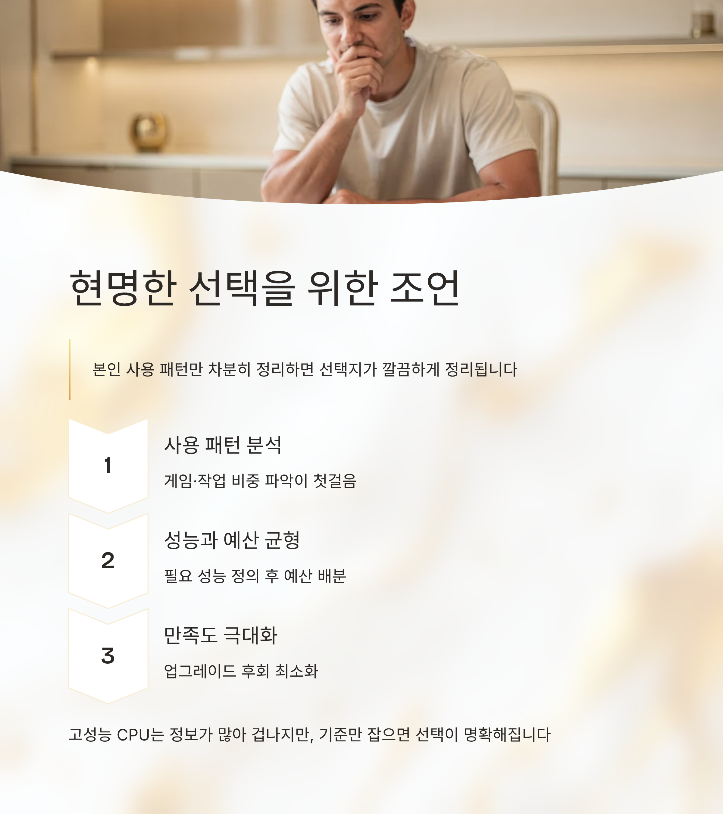 고성능 CPU 쪽은 정보도 많고 말도 많아서, 처음 접하면 괜히 겁부터 나는 경우가 많아요. 하지만 실제로는 본인 사용 패턴만 차분하게 정리해 보시면 생각보다 선택지가 깔끔하게 정리돼요. 오늘 정리한 기준들을 머릿속에만이라도 한 번 떠올려 보시고, 나에게 필요한 성능과 예산 사이의 균형을 어떻게 맞출지 천천히 고민해 보시면 좋겠어요. 그러면 업그레이드를 하더라도 만족도가 훨씬 높아지고, 괜히 돈 썼다는 느낌도 덜하실 거예요.