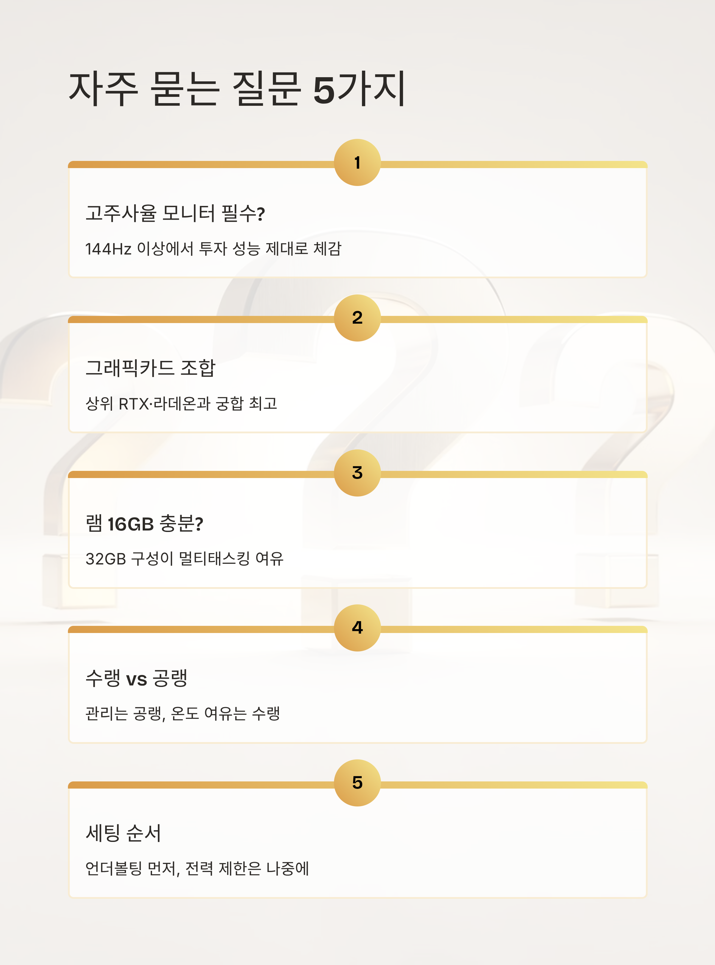 정리하자면, 고주사율 모니터를 이미 쓰고 있고 향후 그래픽카드 업그레이드도 계획하고 있다면 투자할 만한 라인이라고 보시면 돼요. 반대로 FHD 60Hz 모니터에 캐주얼 게임 위주라면 굳이 여기까지 올라올 필요는 없고요. 이런 감으로 스스로 기준을 한 번 잡아보시면 선택이 훨씬 편해져요.