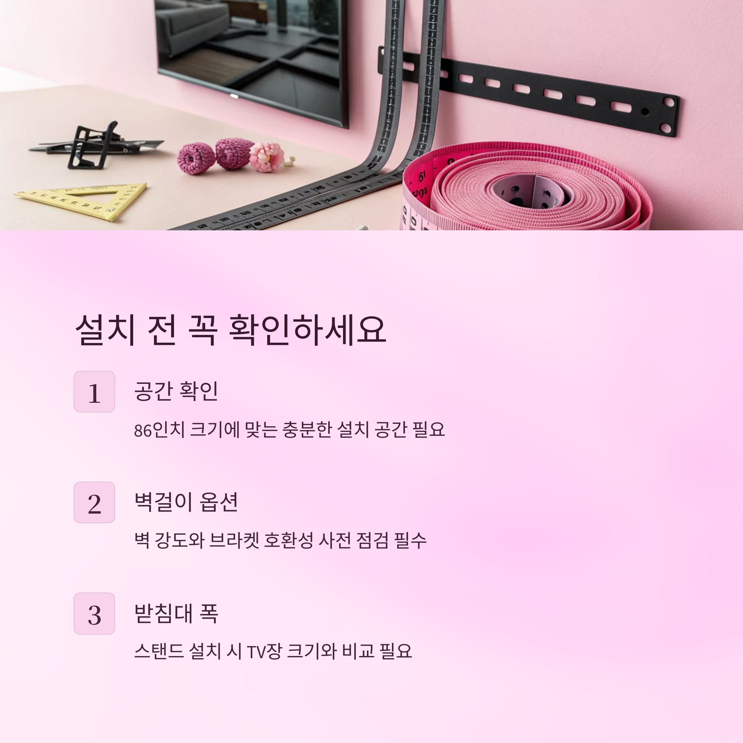 TV 설치 공간 치수 확인과 벽 강도 점검을 미리 해두시면 좋아요.