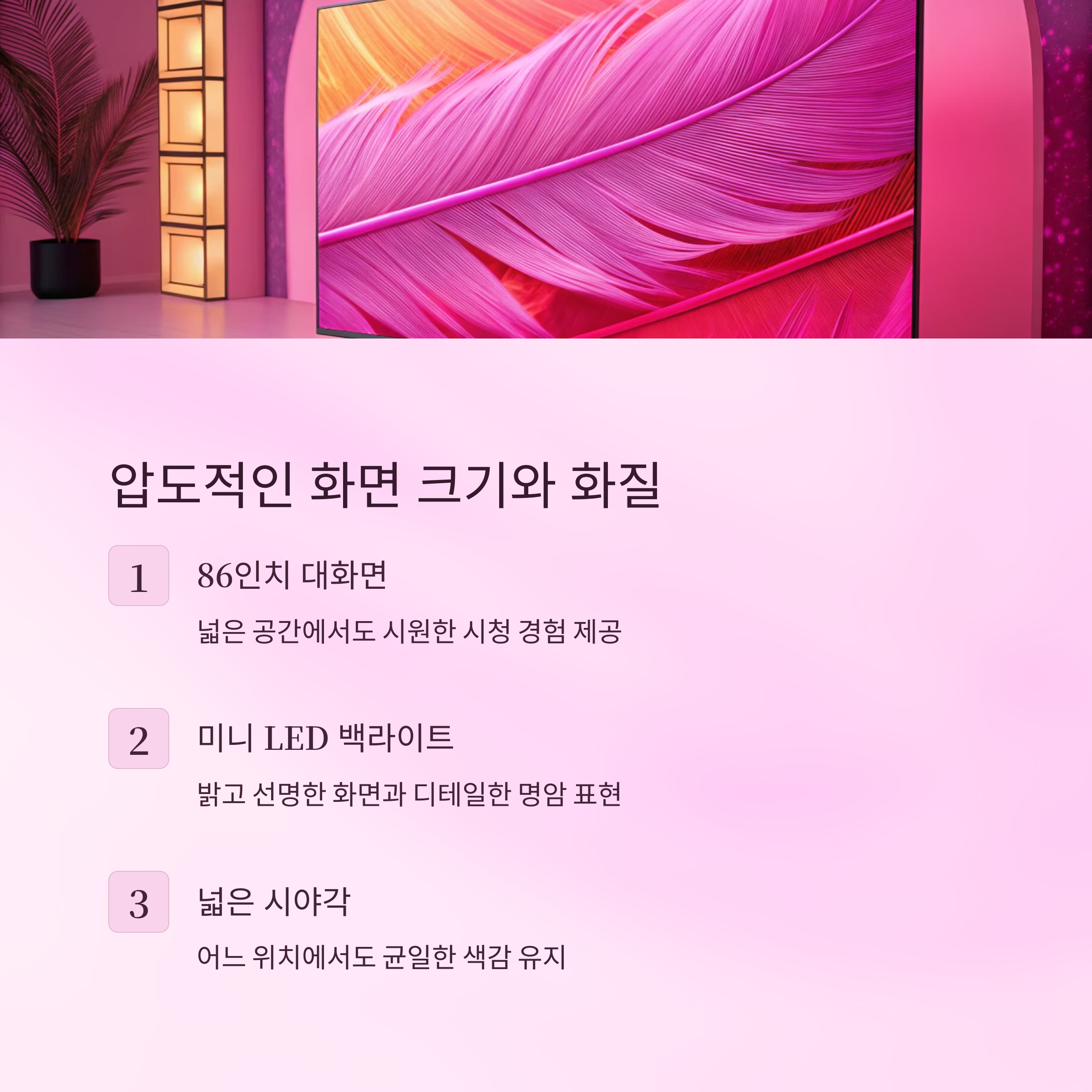 대형 TV를 찾는 분들이 가장 기대하시는 건 역시 압도적인 화면이 주는 시청 경험일 거예요. 이 모델은 86인치 크기로, 일반적인 거실은 물론 넓은 공간에서도 부족함 없이 시원시원한 화면을 보여줍니다. 거기에 QNED 기술이 더해지면서 밝기, 색감, 명암비까지 상당히 고급스러운 인상을 주고 있답니다.