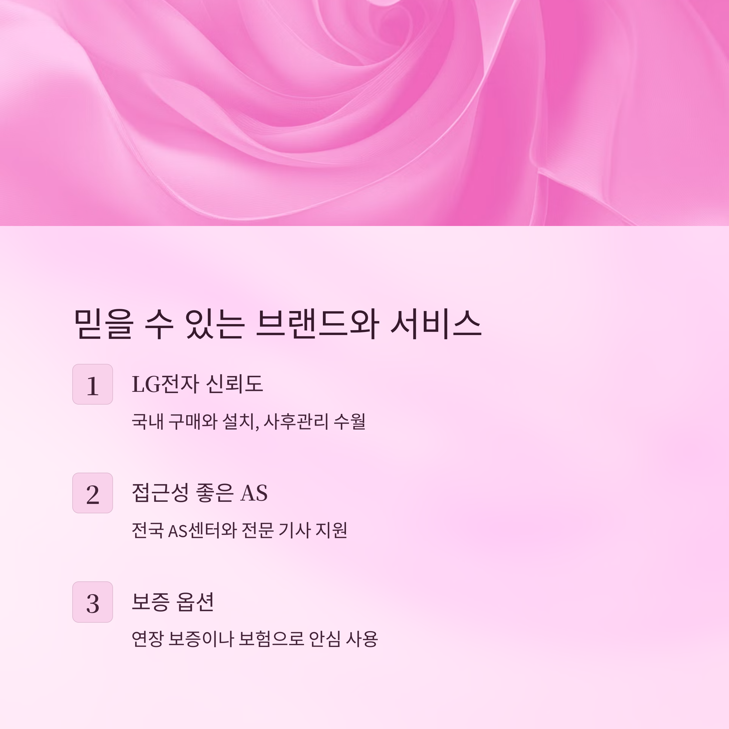 대형 가전은 한 번 구매하면 오랫동안 사용하는 만큼, 브랜드에 대한 신뢰도와 서비스 정책도 꼼꼼히 따져보시는 게 좋겠죠. 이 제품은 LG전자에서 출시된 모델이라, 국내에서 구매와 설치, 사후관리까지 비교적 수월하게 진행하실 수 있어요.