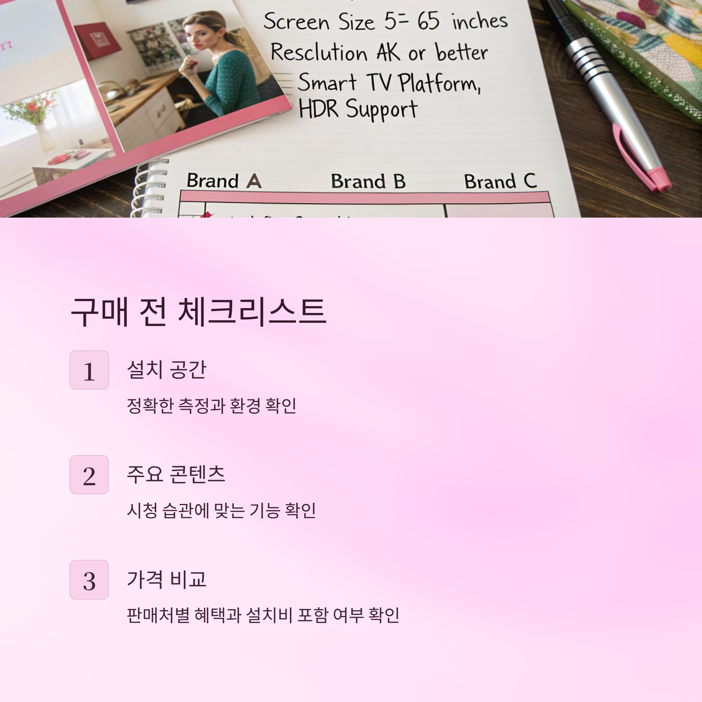 TV 설치 공간 치수 확인과 벽 강도 점검을 미리 해두시면 좋아요.