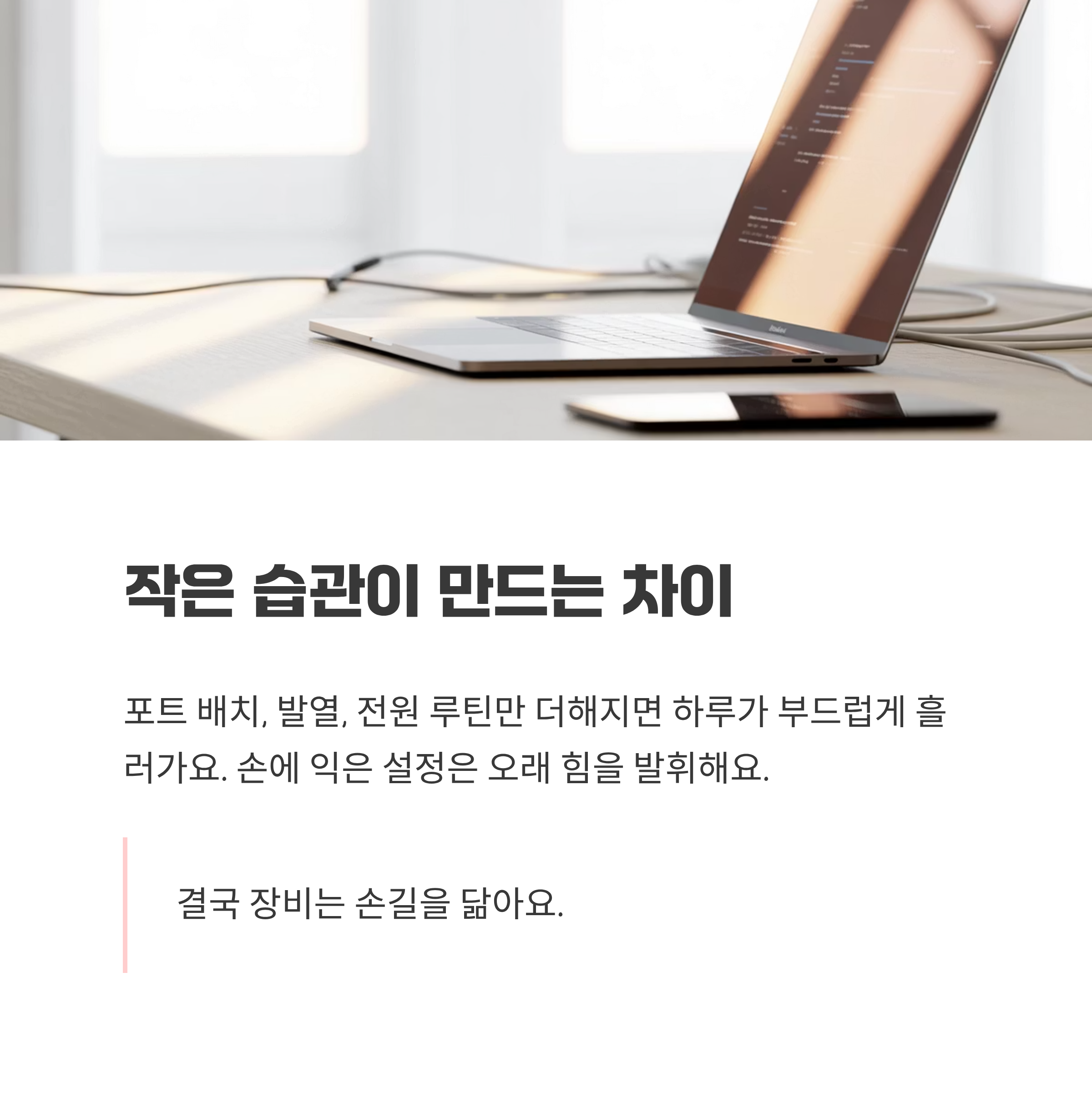 출장이나 외근이 많다면 전원 어댑터를 하나 더 두고, 케이블과 허브를 소형 파우치로 고정해 분실을 막아요. 작은 준비가 하루의 여유를 만들어요.