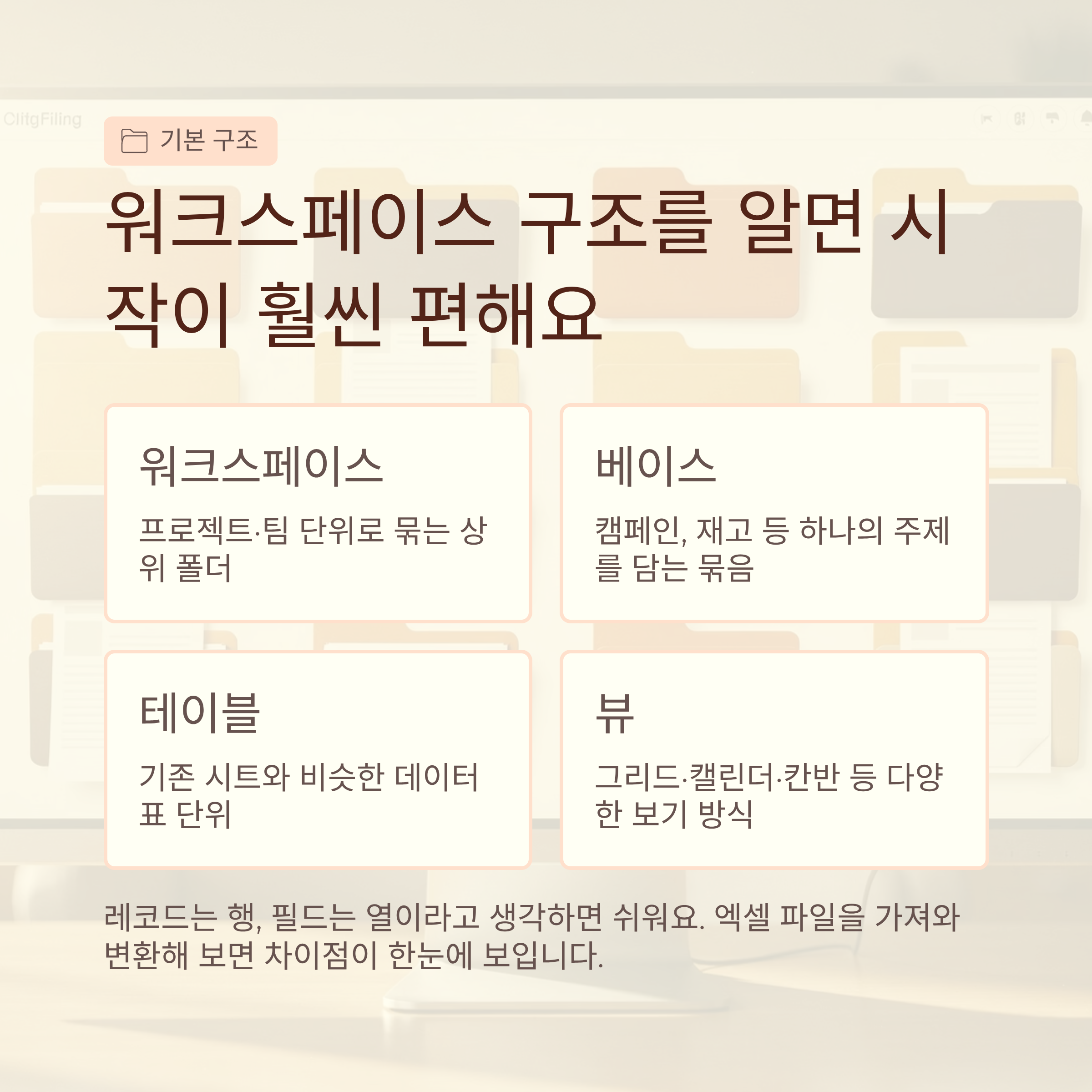 처음 접속하면 가장 먼저 보이는 게 여러 개의 베이스와 뷰들이에요. 이름만 보면 복잡해 보이지만, 사실 워크스페이스는 서랍, 베이스는 서류철, 테이블은 시트라고 생각하면 훨씬 이해가 쉬워요. 이렇게 머릿속에서 비슷한 개념으로 바꿔 두면 새로운 용어 때문에 겁먹을 일이 확 줄어들어요.