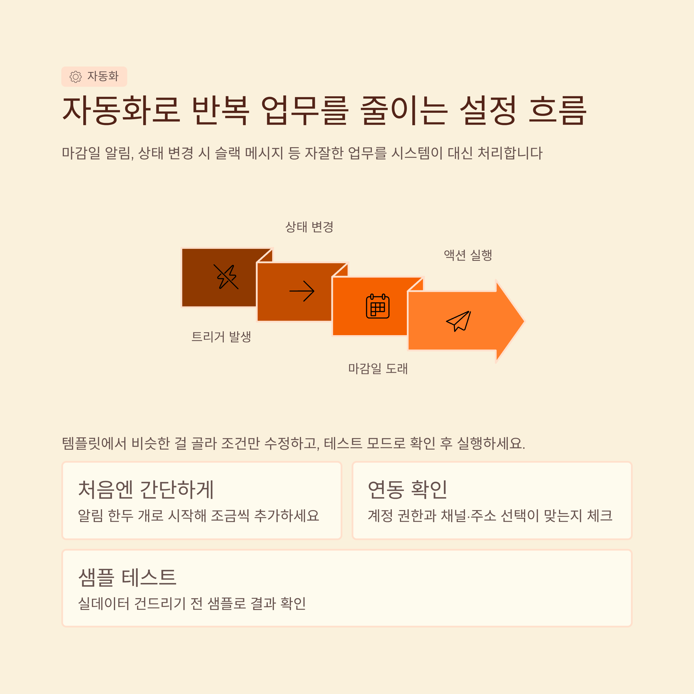 어느 정도 구조가 익숙해졌다면 다음으로 만져볼 만한 게 자동화 기능이에요. 마감일이 다가오면 메일을 보내거나, 특정 상태로 바뀌었을 때 슬랙 알림을 보내는 식으로 자잘한 알림 업무를 대신해 주거든요. 예전엔 직접 캘린더에 다 적어 두고 확인해야 했던 일들이라, 한 번 맛을 보면 없던 시절로 돌아가기 싫어져요.