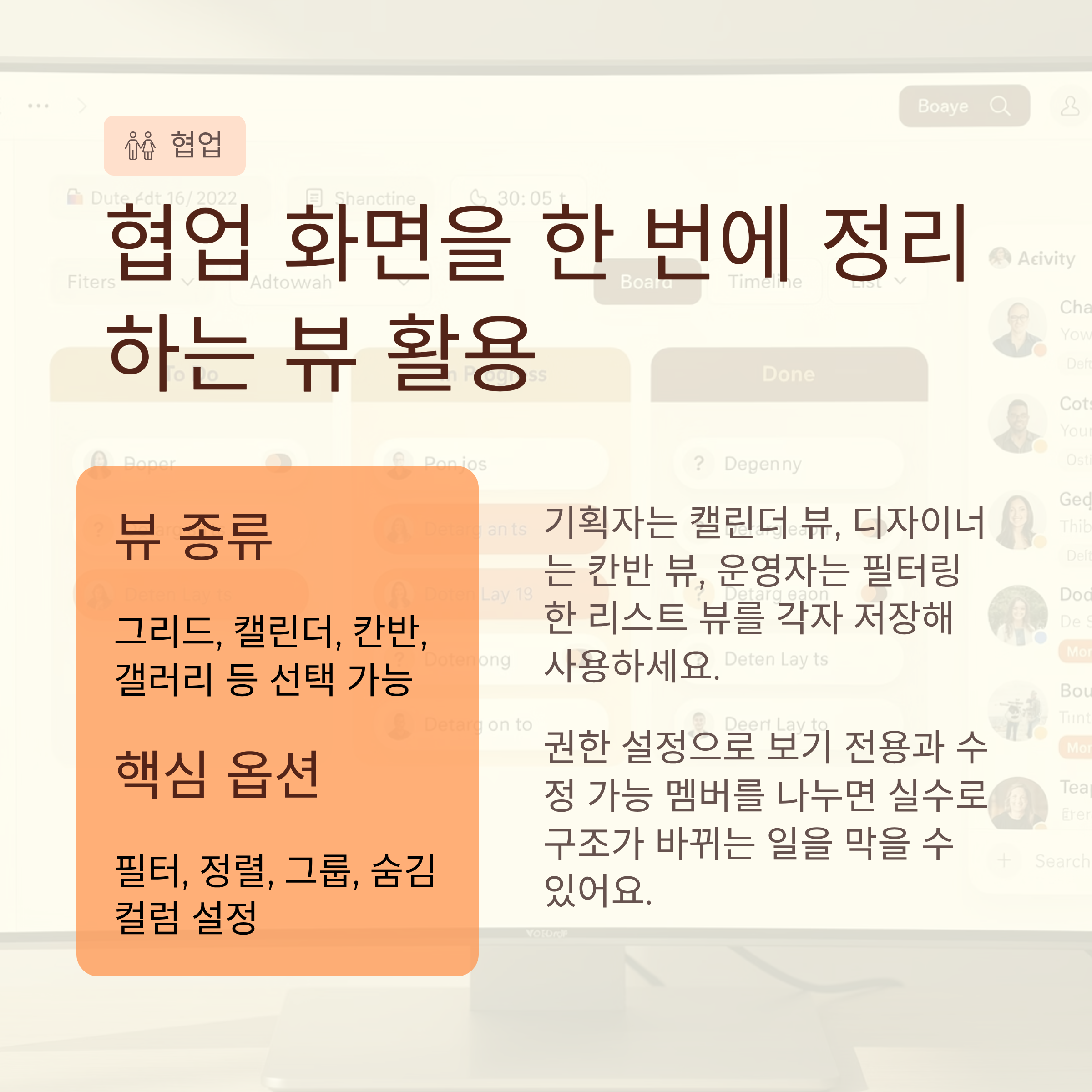 예를 들어 기획자는 전체 타임라인이 보이는 캘린더 뷰를, 디자이너는 작업 단계가 한눈에 보이는 칸반 뷰를, 운영 담당자는 마감 임박 항목만 필터링한 리스트 뷰를 쓰는 식이에요. 필터·정렬·그룹 기능을 조합해서 내가 보고 싶은 기준을 잡아두고, 뷰 이름으로 용도를 표시해 두면 팀원끼리 공유하기도 편하더라고요.