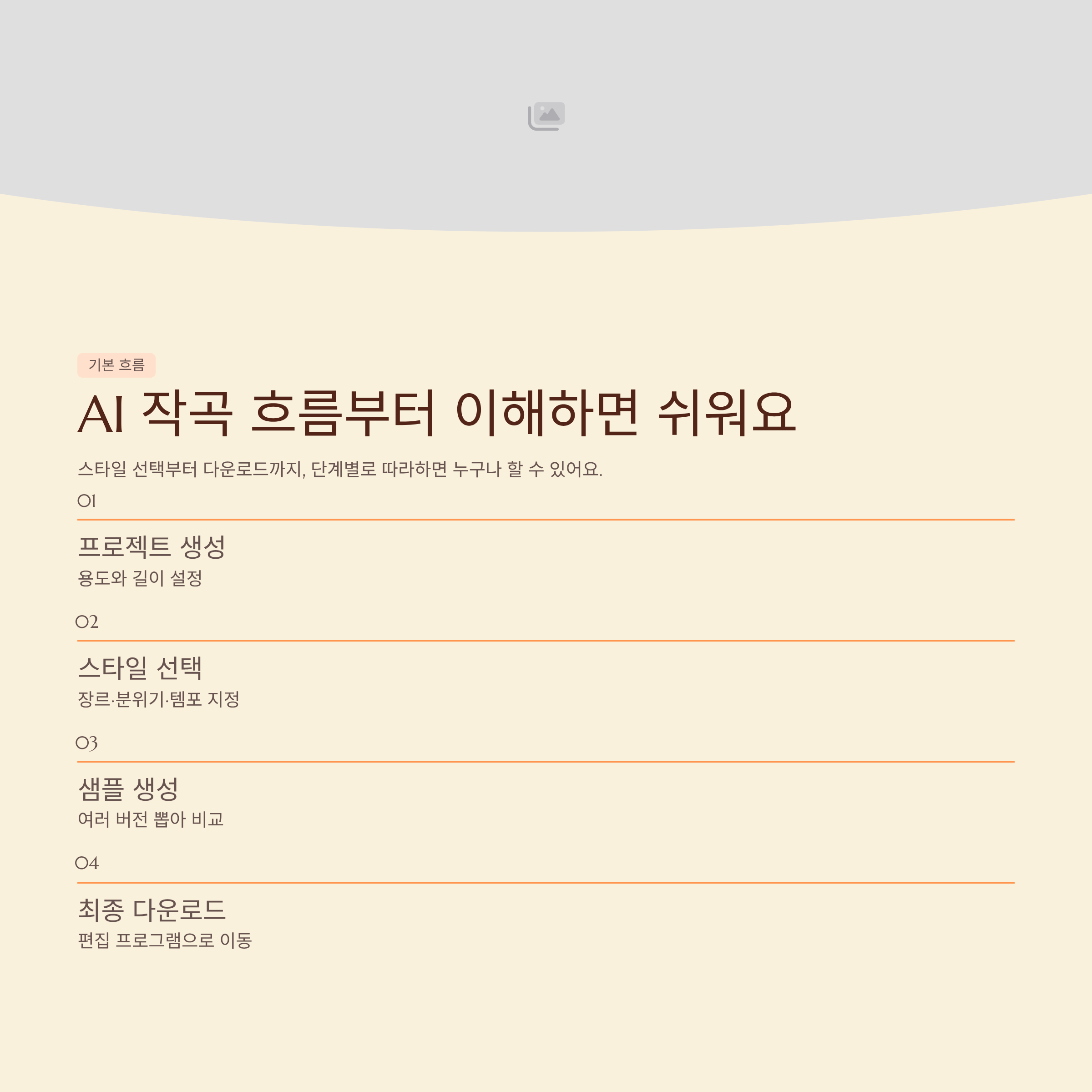 | Q. 장르가 너무 많아서 뭘 골라야 할지 모르겠어요. | A. 먼저 즐겨 듣는 곡과 비슷한 장르 하나만 정해서, 그 안에서 분위기를 여러 가지로 바꿔 보는 게 훨씬 수월해요. |