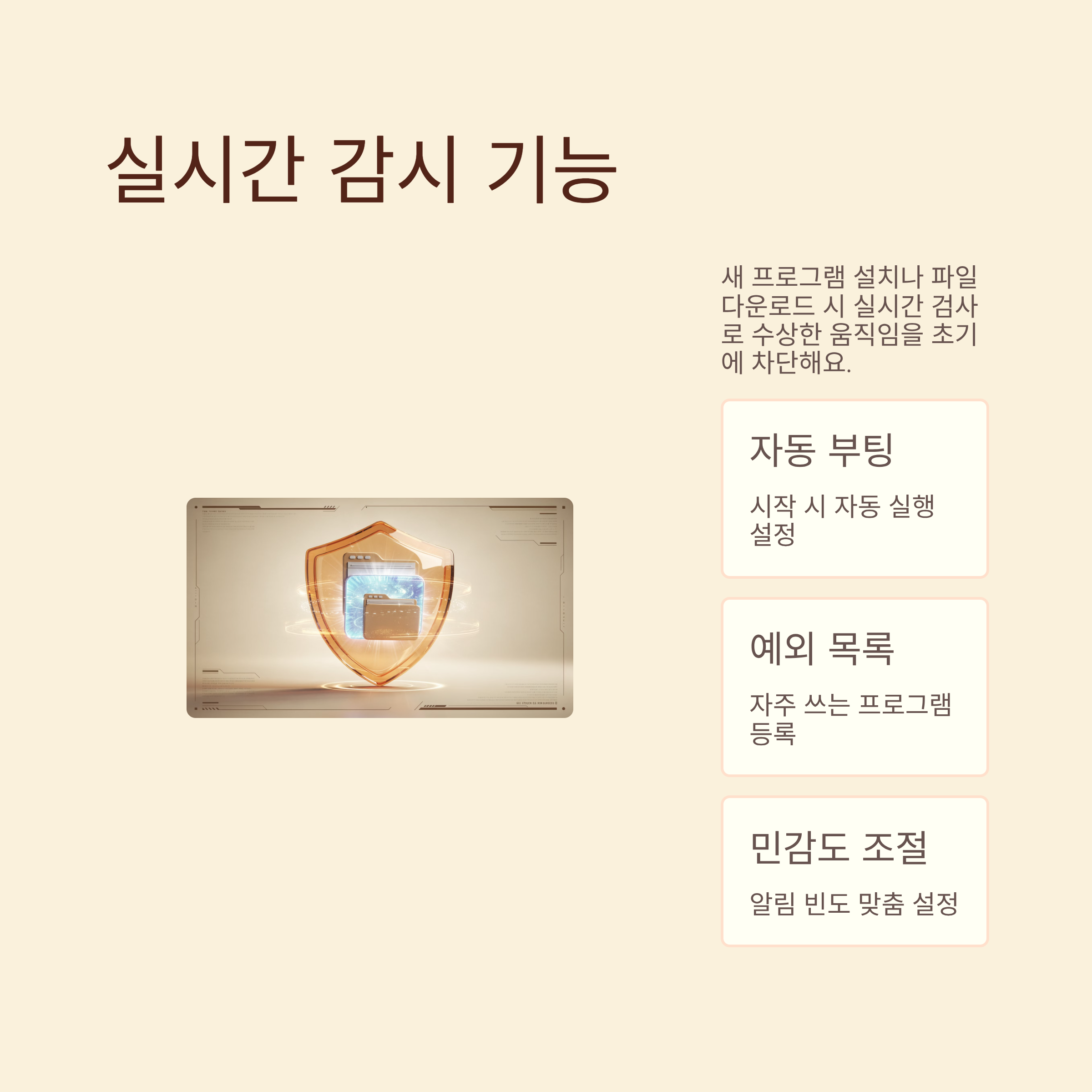 보안 프로그램의 핵심은 눈에 안 보이는 순간에도 뒤에서 조용히 지켜봐 주는 기능이에요. 새 프로그램을 설치하거나 웹사이트에서 파일을 받을 때 실시간으로 검사해 주면, 수상한 움직임을 초기에 잡아낼 확률이 훨씬 올라가요.