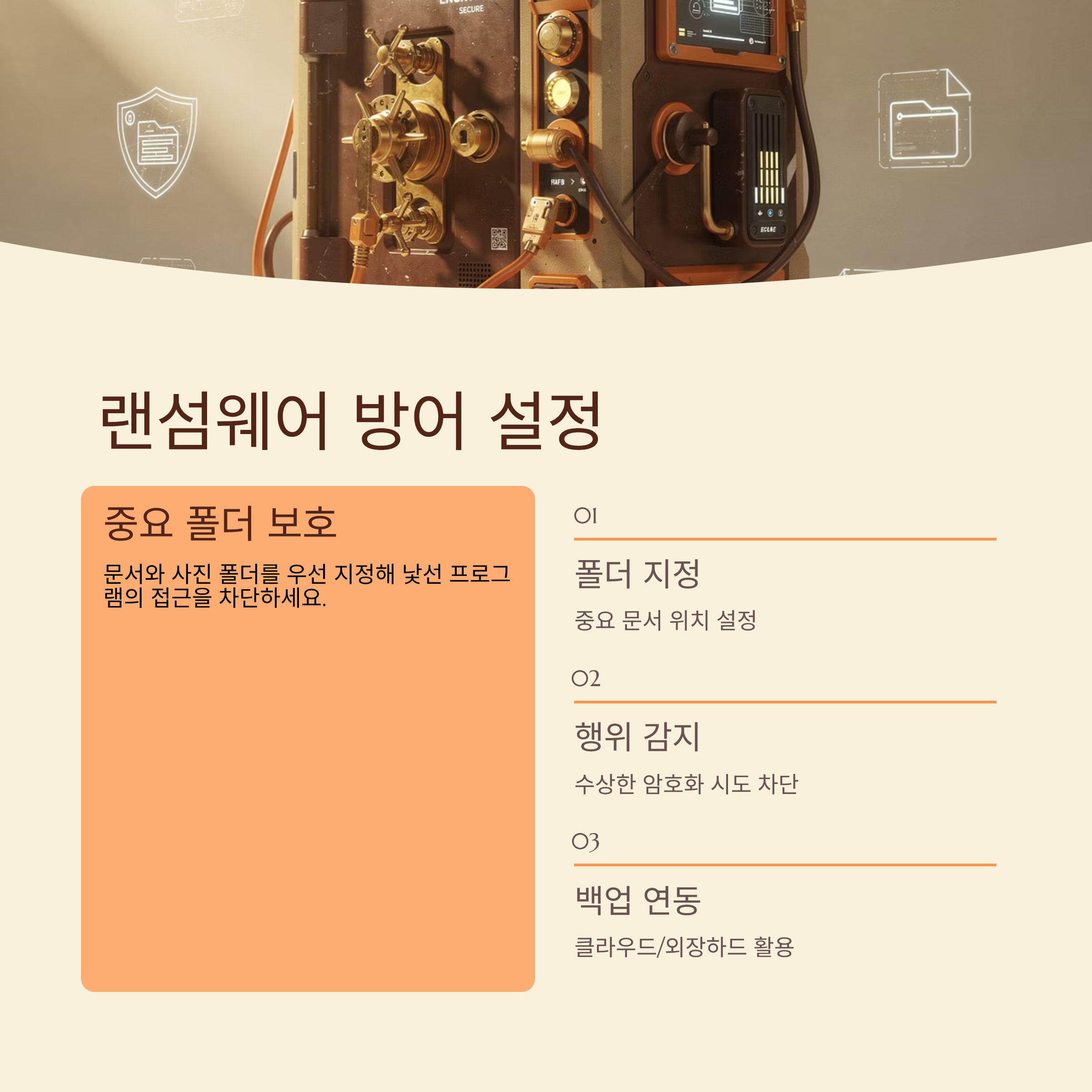 요즘에는 파일을 인질로 잡고 돈을 요구하는 악성 코드가 가장 큰 걱정거리라, 문서 보호 기능이 있는지 꼭 확인해 보는 게 좋아요. 특정 폴더를 보호 대상으로 지정해 두면, 낯선 프로그램이 그 안의 파일을 바꾸려 할 때 바로 막아 주는 방식이 많아요.