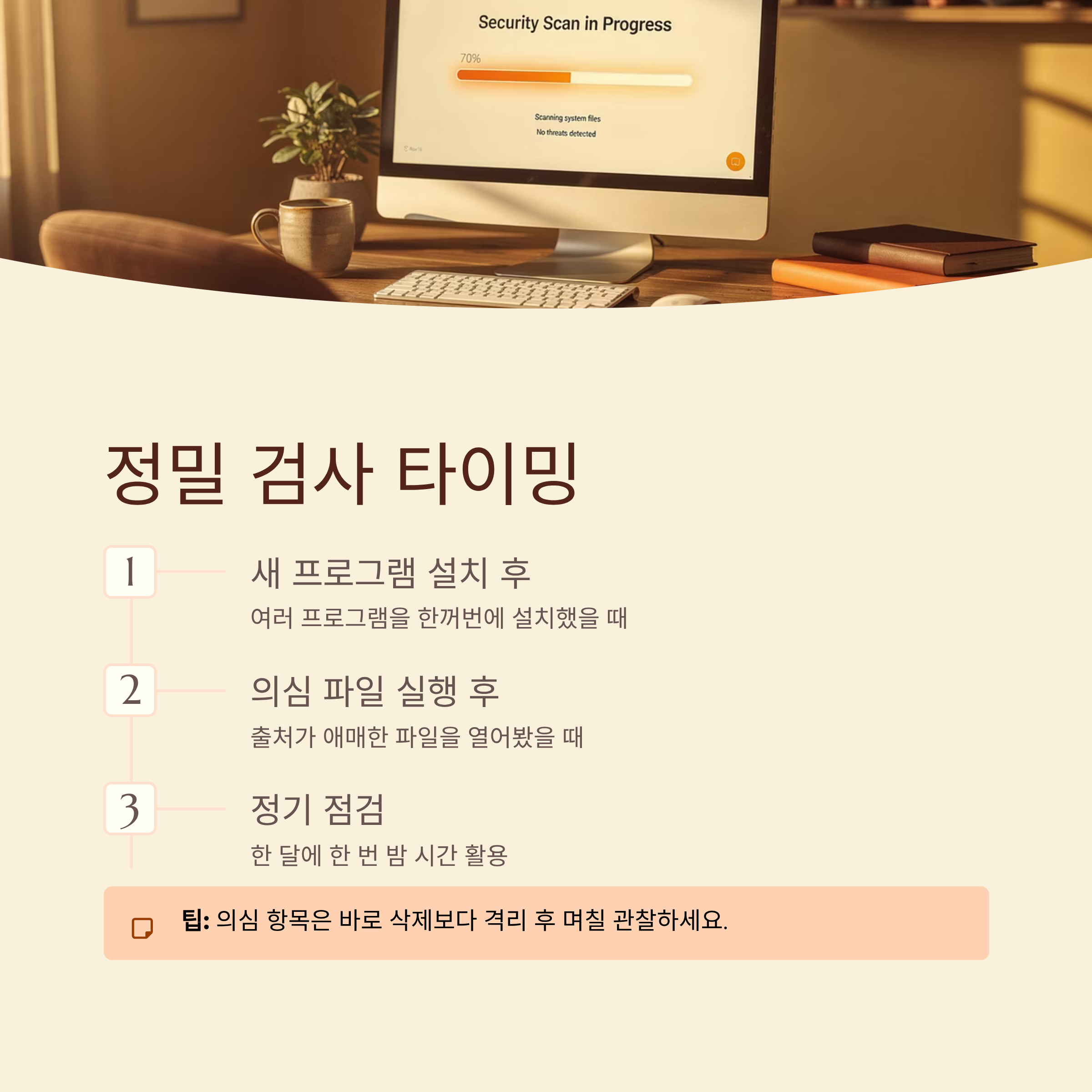 평소에는 가벼운 빠른 검사만 돌리다가, 뭔가 이상하다 싶을 때는 정밀 검사를 한 번쯤 해 보는 게 좋아요. 새 프로그램을 많이 설치했거나, 출처가 애매한 파일을 여러 개 열어봤을 때가 대표적인 경우예요.