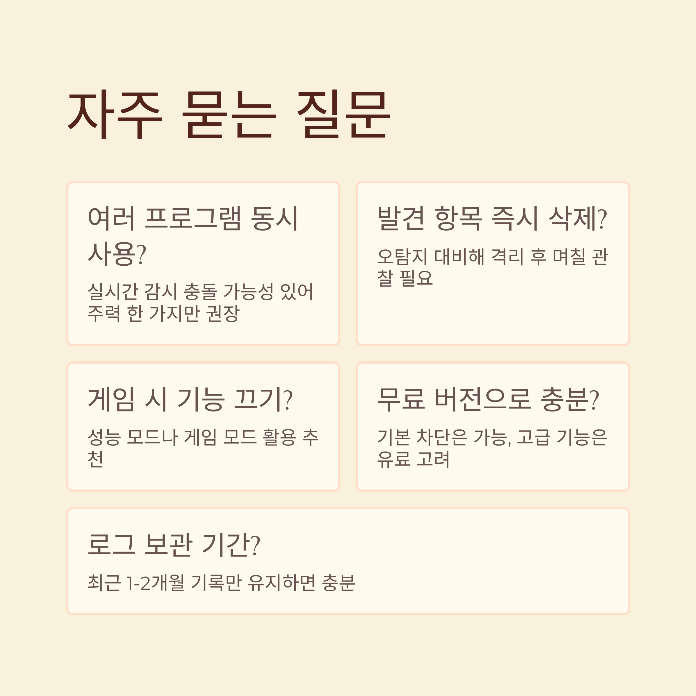 A1. 실시간 감시 기능이 겹치면 속도가 느려지거나 충돌이 날 수 있어서, 주력으로 쓸 것 한 가지만 남기는 경우가 많아요.
