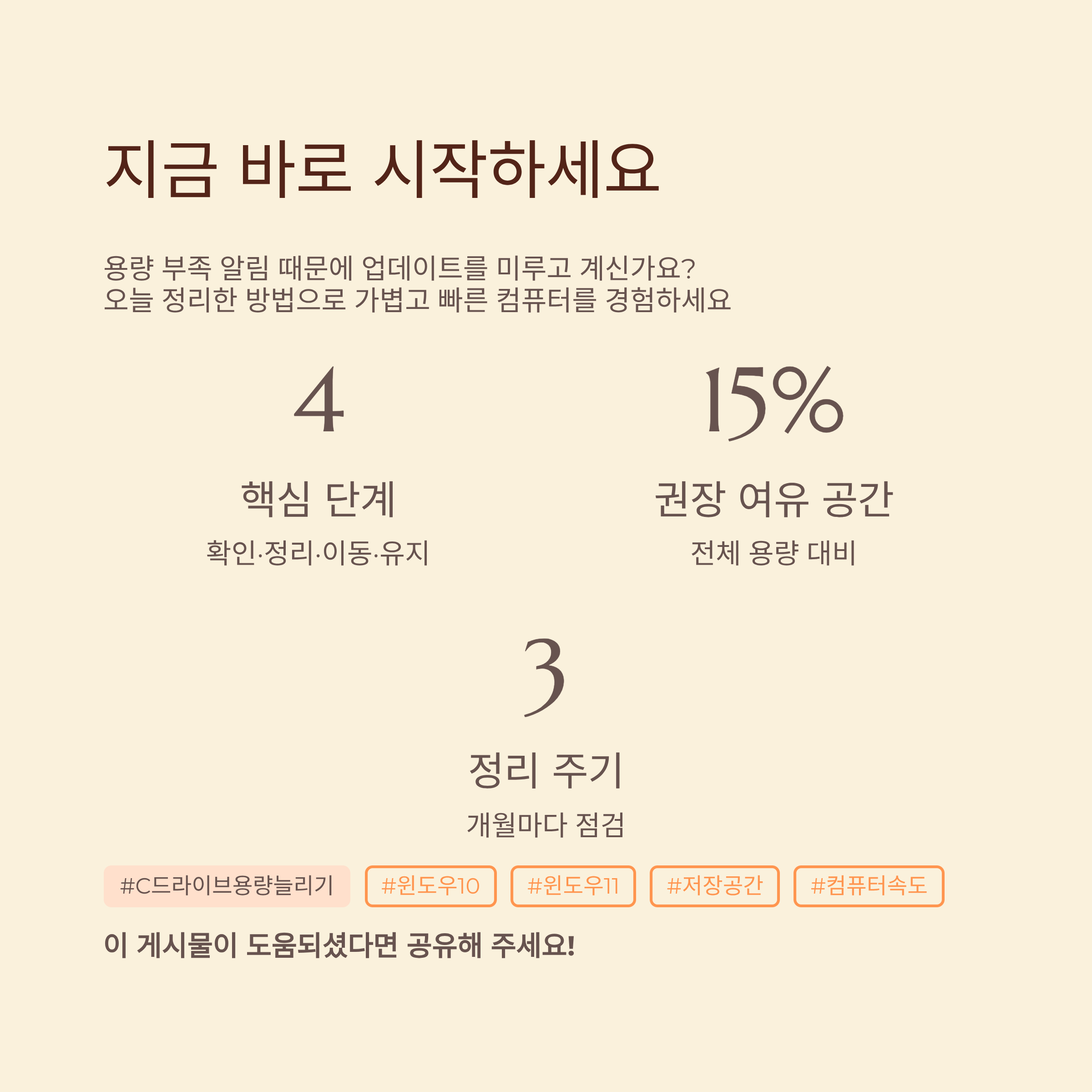 주기적으로 체크할 수 있도록 한 달에 한 번 정도 점검일을 정해 두면 좋아요. 이날에는 다운로드 폴더와 바탕화면, 휴지통, 클라우드 동기화 폴더만 간단히 훑어봐도 관리가 훨씬 수월해져요. 이 카드만 저장해두셔도 나중에 정리할 때 훨씬 편하실 거예요.
