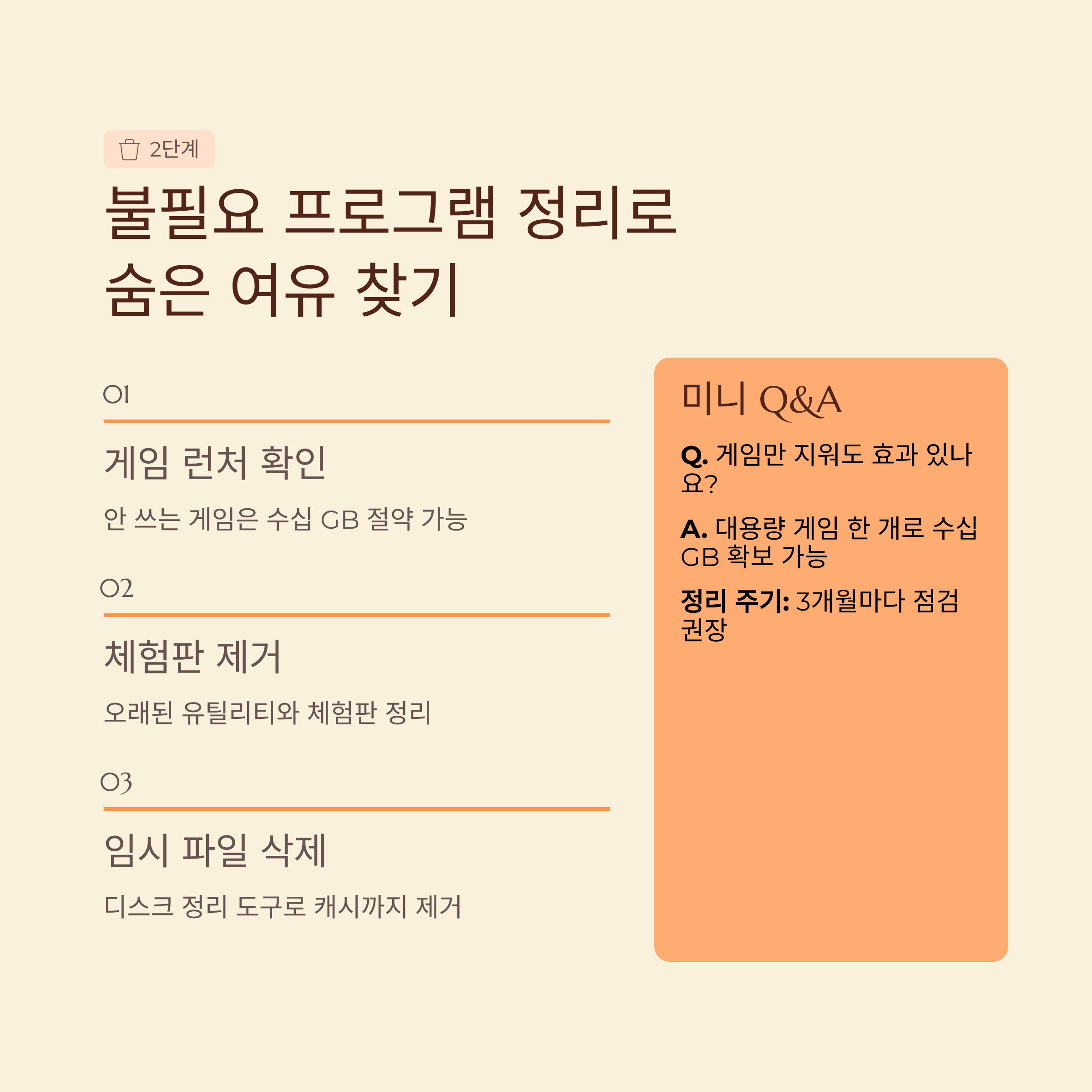 | Q. 정리 주기는 어느 정도가 적당할까요? | A. 게임이나 프로그램을 자주 설치·삭제한다면 최소 3개월에 한 번씩 점검해 주는 게 좋아요. |
