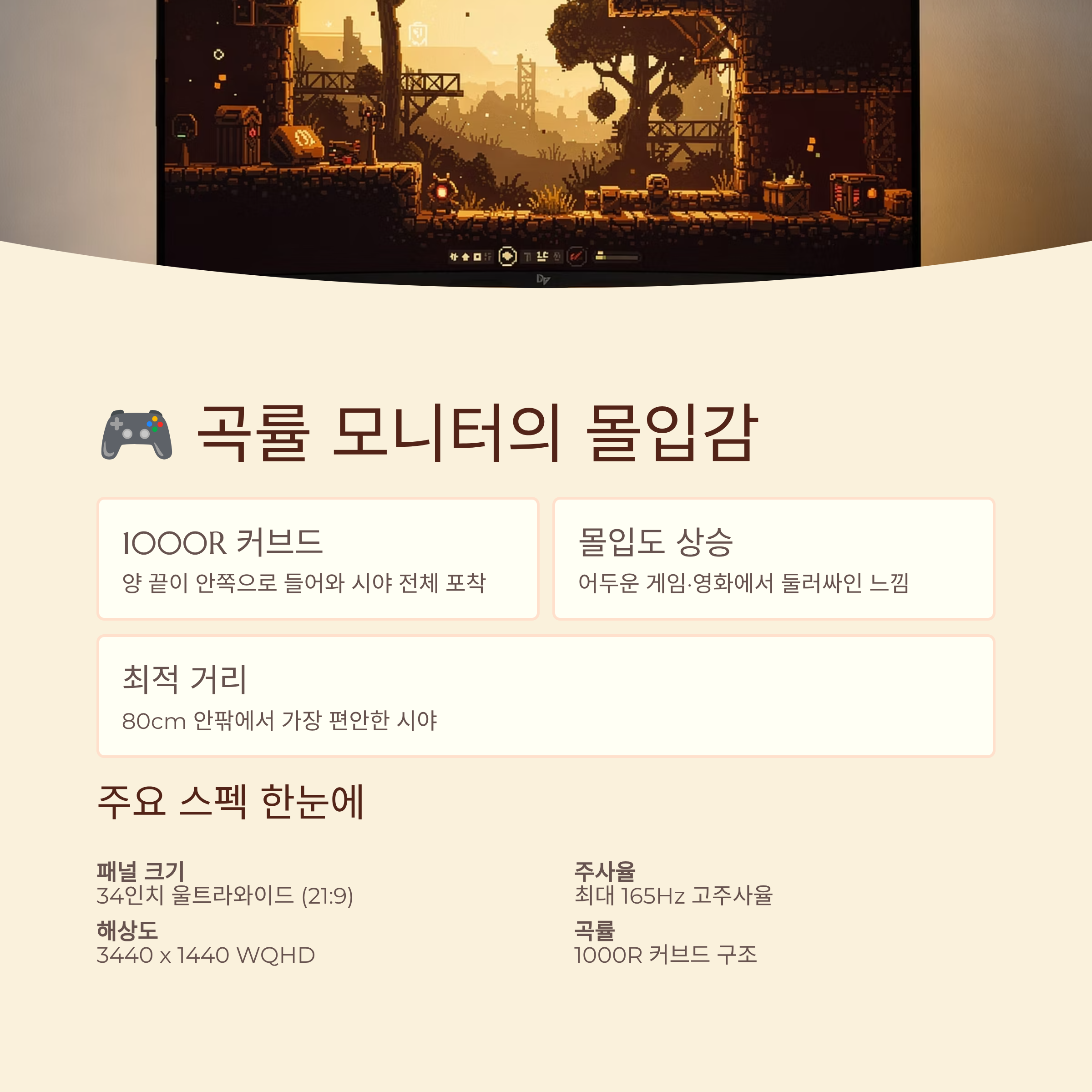 특히 어두운 배경이 많은 게임이나 영화에서 화면에 더 둘러싸인 느낌이 나서, 평소보다 몰입도가 확 올라가는 순간이 있어요. 대신 책상이 너무 좁거나, 화면과 거리가 너무 가까우면 곡률이 과하게 느껴질 수 있으니 설치 거리도 같이 생각해 두는 게 좋아요.