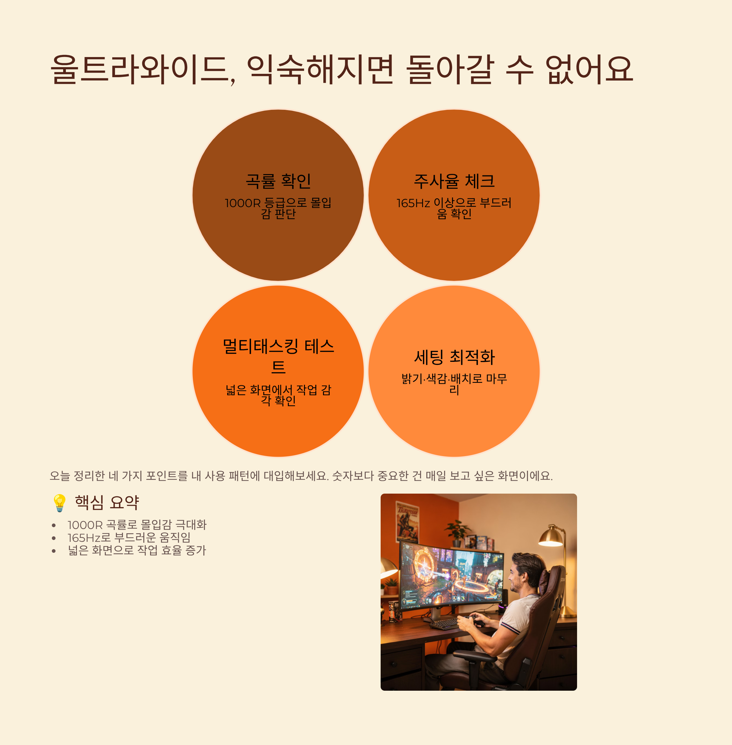 울트라와이드 커브드 모니터는 막상 써 보기 전에는 과하지 않을까 고민이 많지만, 한 번 익숙해지고 나면 다시 좁은 화면으로 돌아가기 애매해지는 제품군이에요. 오늘 정리한 곡률, 주사율, 멀티태스킹, 세팅 네 가지 포인트만 기억해 두고 내 사용 패턴에 대입해 보시면 선택이 훨씬 쉬워질 거예요. 결국 숫자보다 중요한 건 내가 매일 어떤 장면을 보고 싶은지라서, 상상해 본 화면에 가장 잘 맞는 구성을 천천히 골라 보시면 좋겠어요.