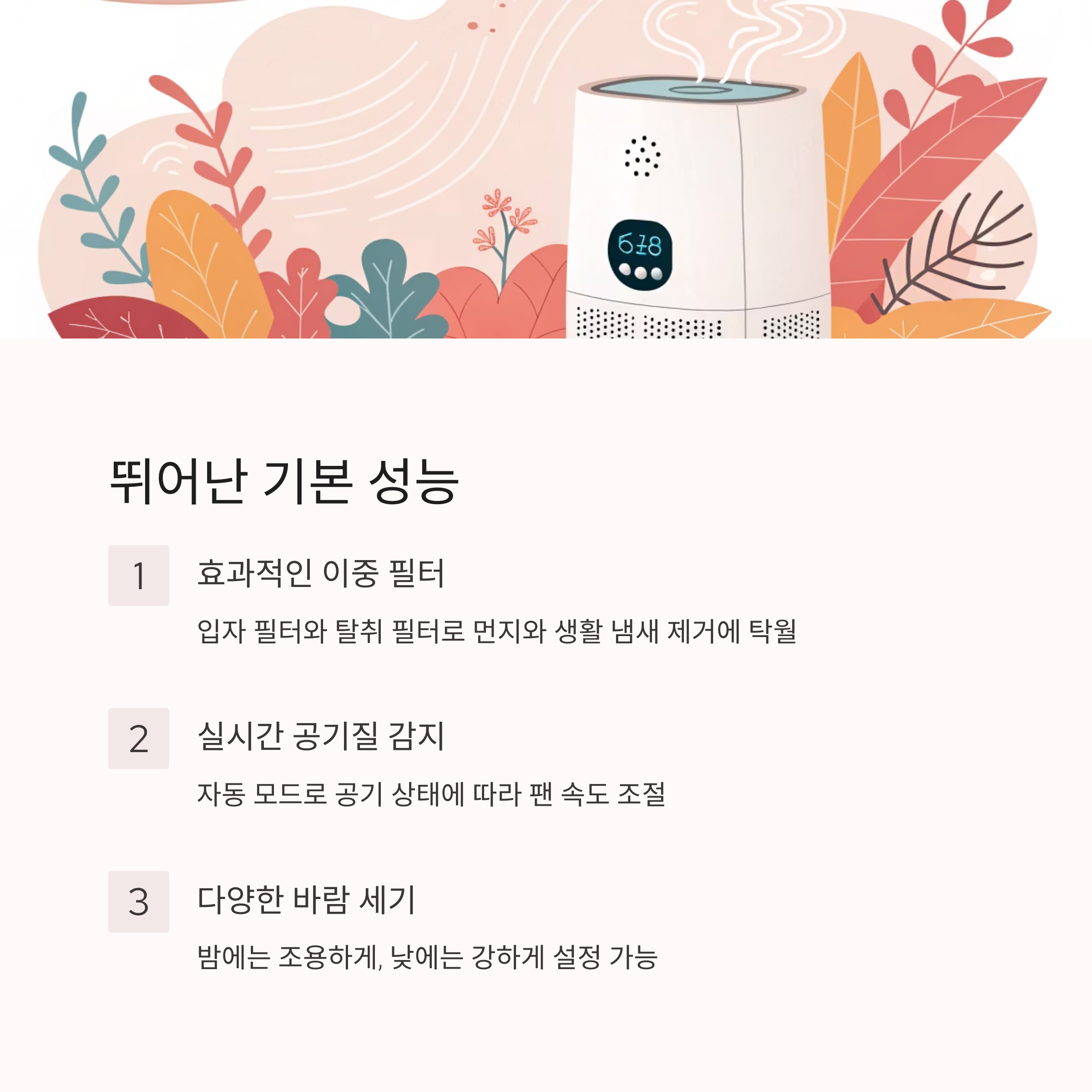 이 제품은 중급 가격대임에도 불구하고 성능과 편의성 면에서 꽤 알찬 구성을 보여주는 모델이에요. 기본 정화 능력과 필터 구성, 조용한 사용감까지 두루 갖추고 있어서 가성비 제품을 찾는 분들께 잘 맞는 선택이었어요.