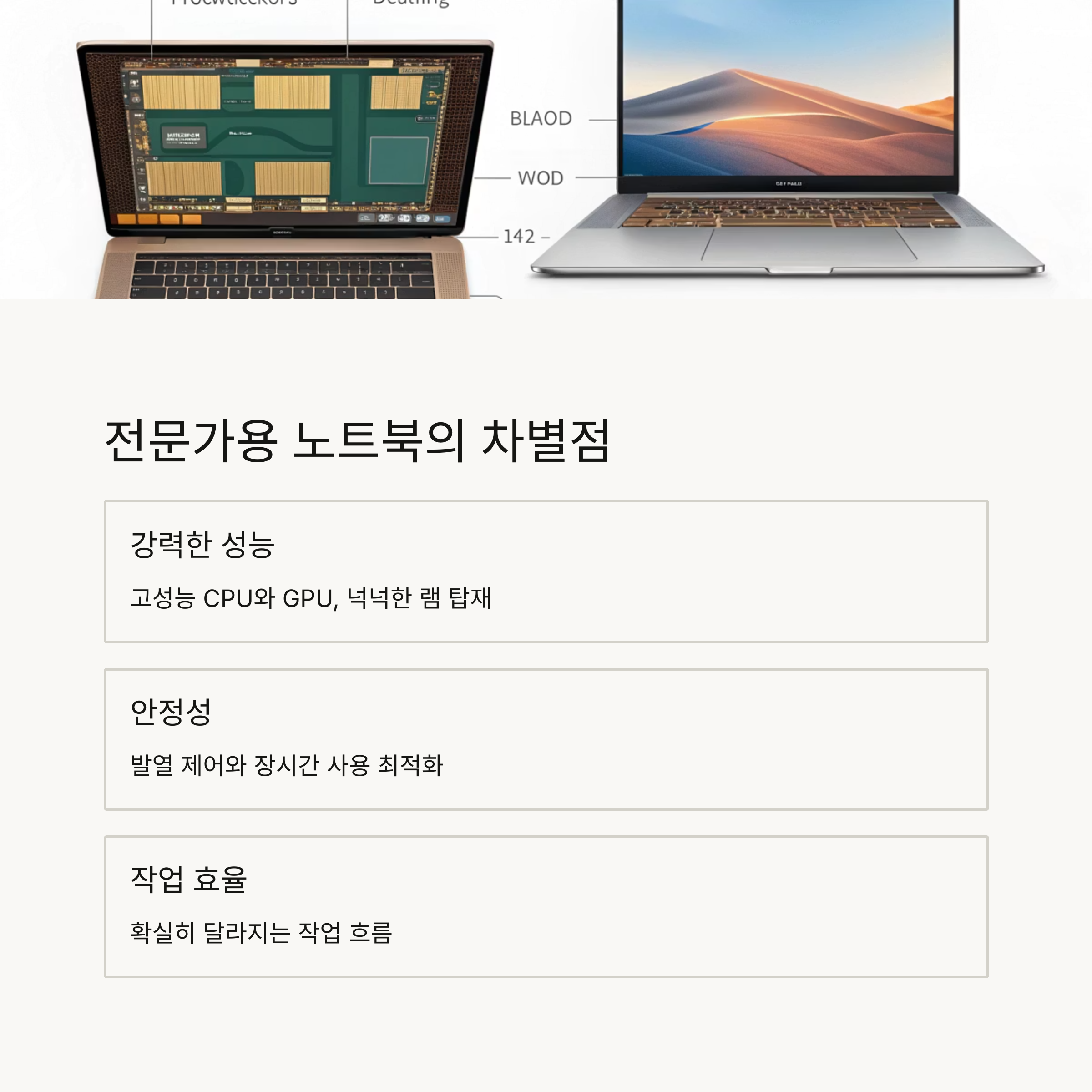 고성능 CPU, GPU, 안정성 중심 설계, 장시간 작업 최적화가 주요 차이예요.