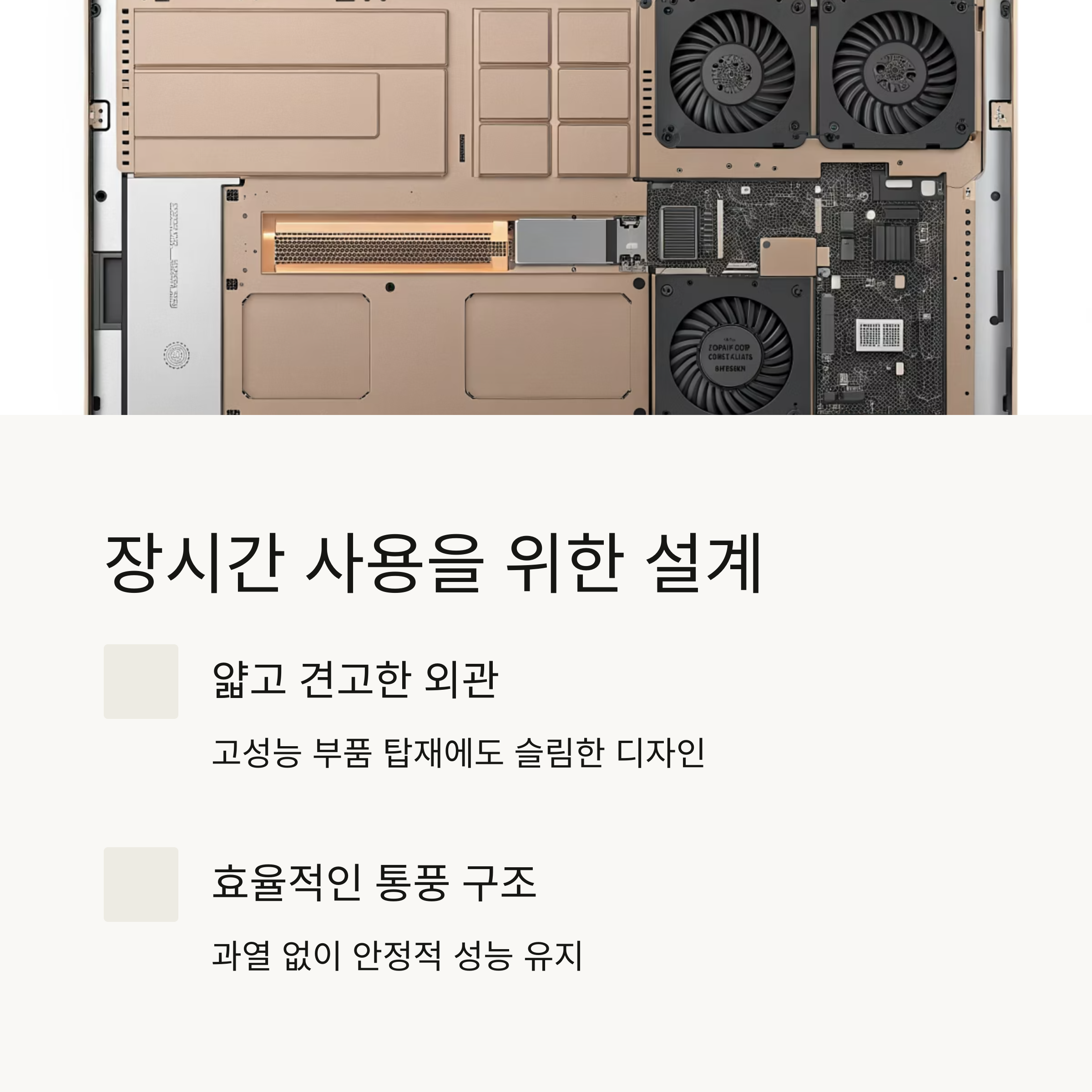 일반 노트북은 대부분 부품 업그레이드가 어려운 구조인데, 이 시리즈는 다르게 설계되었어요. 메모리나 저장장치를 쉽게 확장할 수 있어, 시간이 지나면서도 성능 저하 걱정 없이 계속해서 작업을 이어나갈 수 있어요.