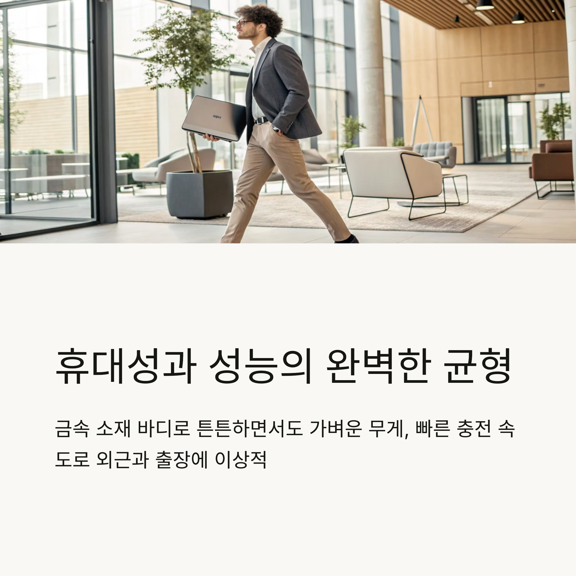 경량화된 설계와 고속 충전 덕분에 외근용으로도 충분히 적합해요.