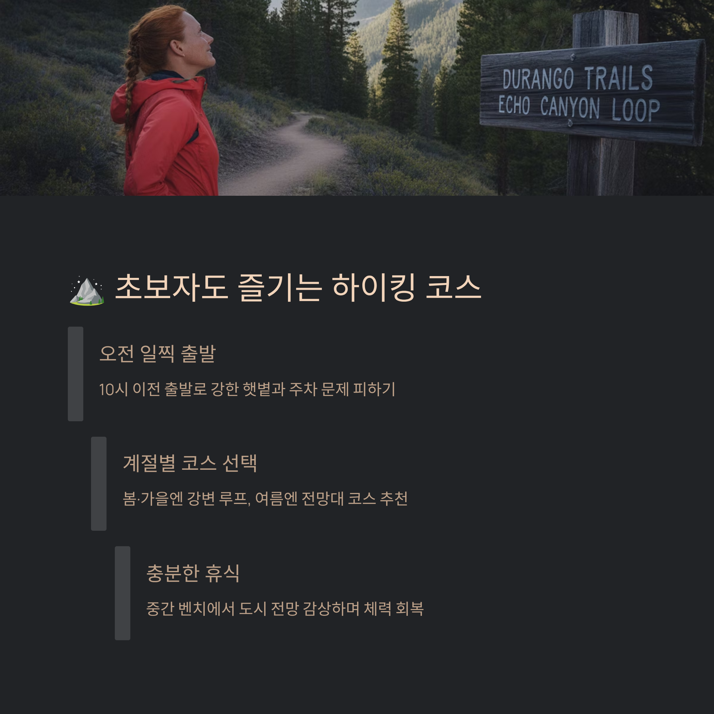 하산 후에는 비타민과 단백질을 챙겨 주면 회복이 빨라요. 샌드위치나 수제 수프를 파는 델리에서 간단히 해결하고, 오후엔 강가에서 피크닉 매트를 깔아 잠깐 누워 보세요. 도시 이름을 굳이 외치지 않아도, 해가 기울 즈음에야 비로소 DURANGO 특유의 공기가 몸에 스며들었다는 걸 느끼게 되거든요. 그렇게 스스로의 속도에 맞춘 하루가 여행의 리듬을 다정하게 잡아 줍니다.