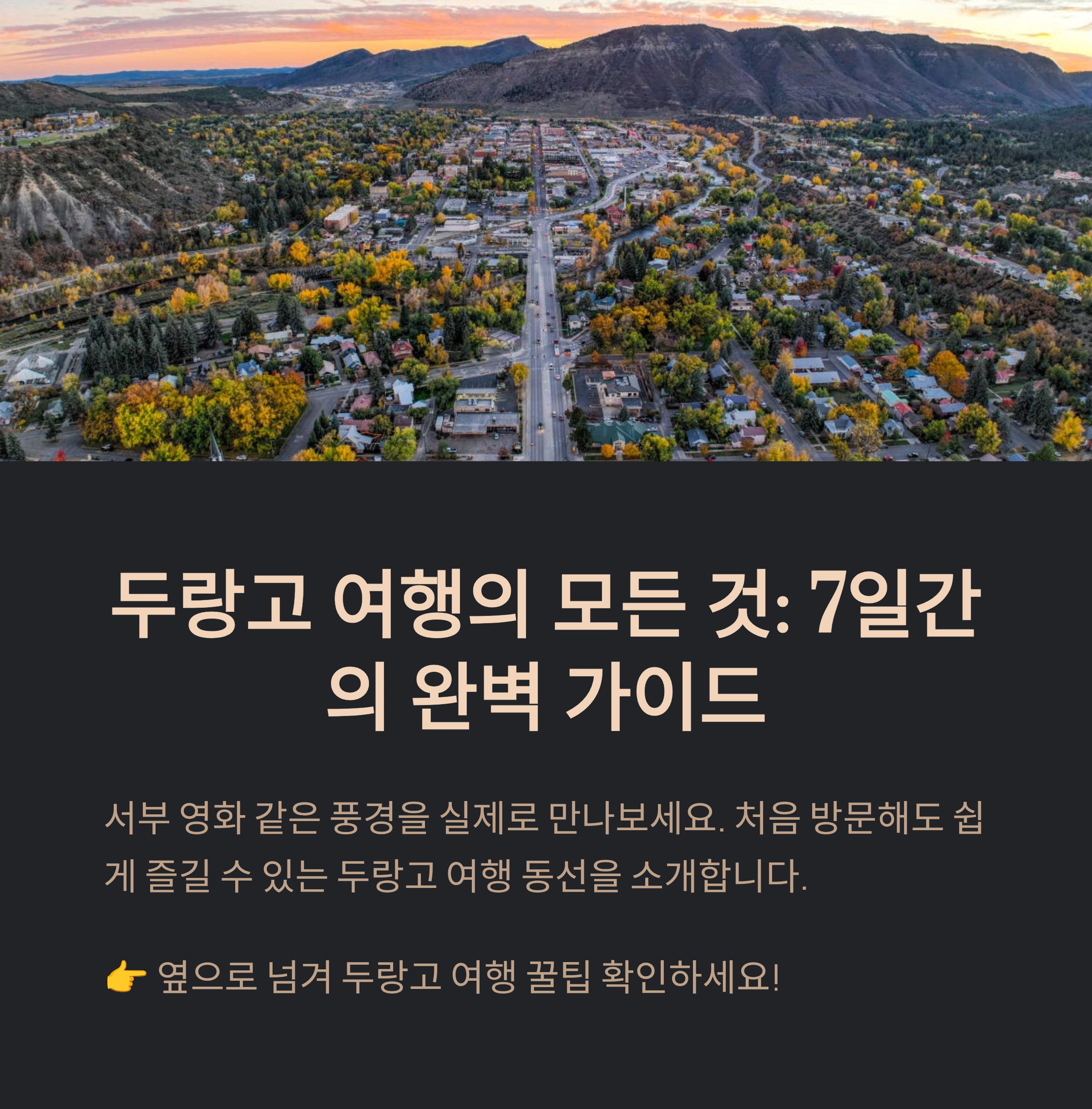 짧은 일정이라면 첫째 날엔 구도심과 박물관, 둘째 날엔 트레일과 강가, 셋째 날엔 근교 소도시를 묶는 식으로 루트를 구성해 보세요. 중간중간 카페나 벤치에서 쉬는 시간을 일정표에 아예 넣어 두면 과로를 피할 수 있어요. 일정표 한 줄에 ‘사진 타임 20분’ 같은 메모를 넣어두면 DURANGO 감성을 남기는 데도 도움이 됩니다.