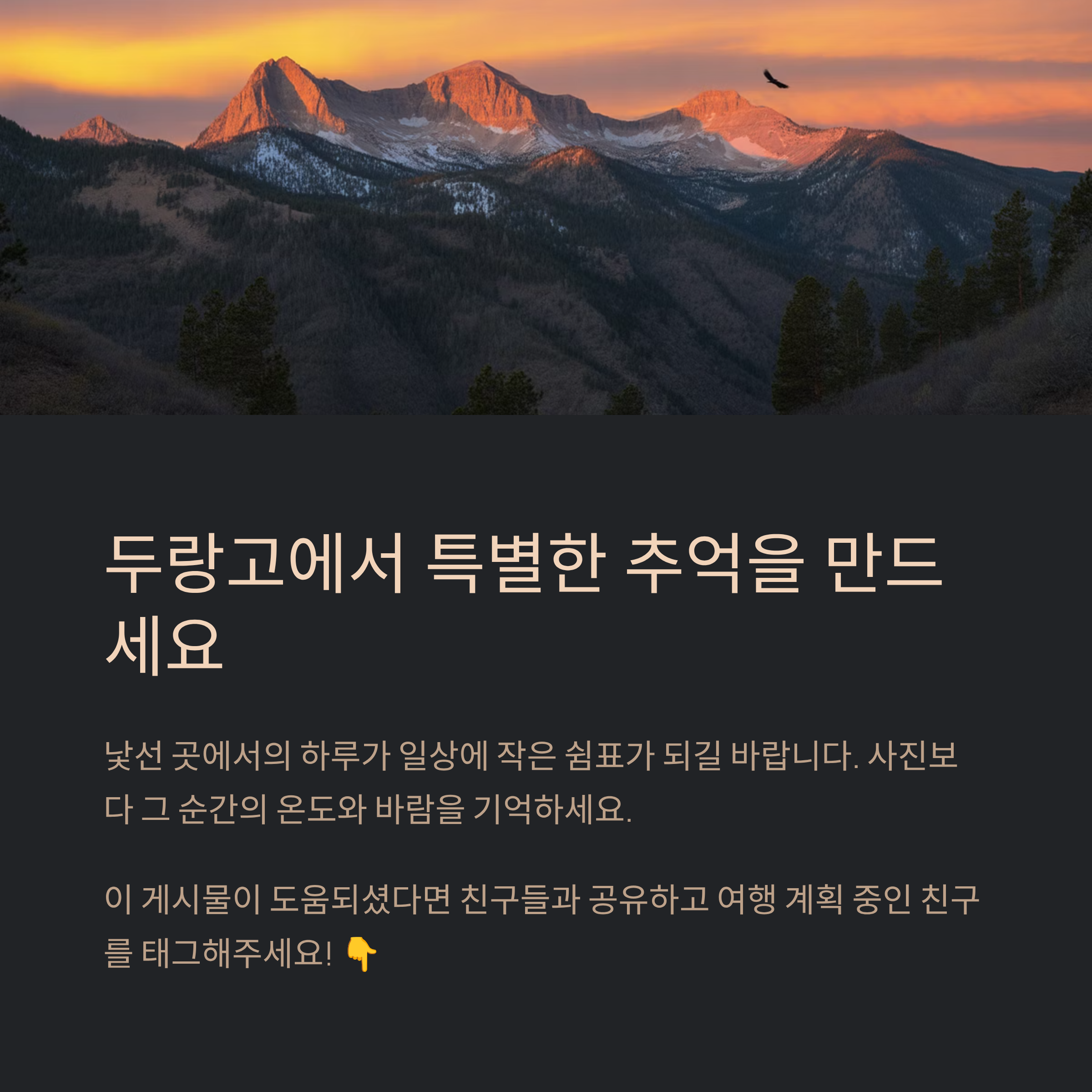 하산 후에는 비타민과 단백질을 챙겨 주면 회복이 빨라요. 샌드위치나 수제 수프를 파는 델리에서 간단히 해결하고, 오후엔 강가에서 피크닉 매트를 깔아 잠깐 누워 보세요. 도시 이름을 굳이 외치지 않아도, 해가 기울 즈음에야 비로소 DURANGO 특유의 공기가 몸에 스며들었다는 걸 느끼게 되거든요. 그렇게 스스로의 속도에 맞춘 하루가 여행의 리듬을 다정하게 잡아 줍니다.