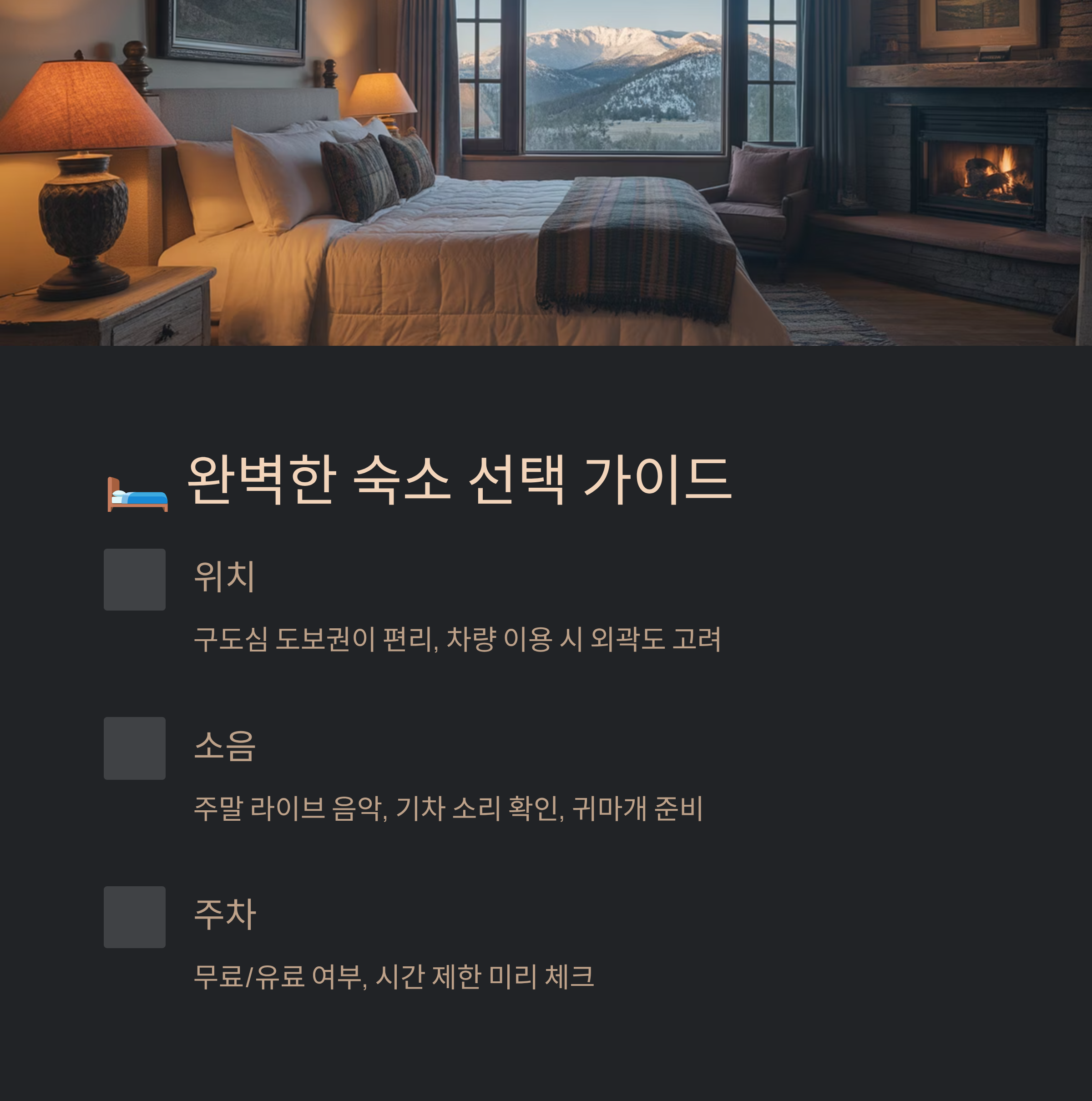 🛏 숙소 고르는 공식: 위치, 소음, 주차의 삼박자