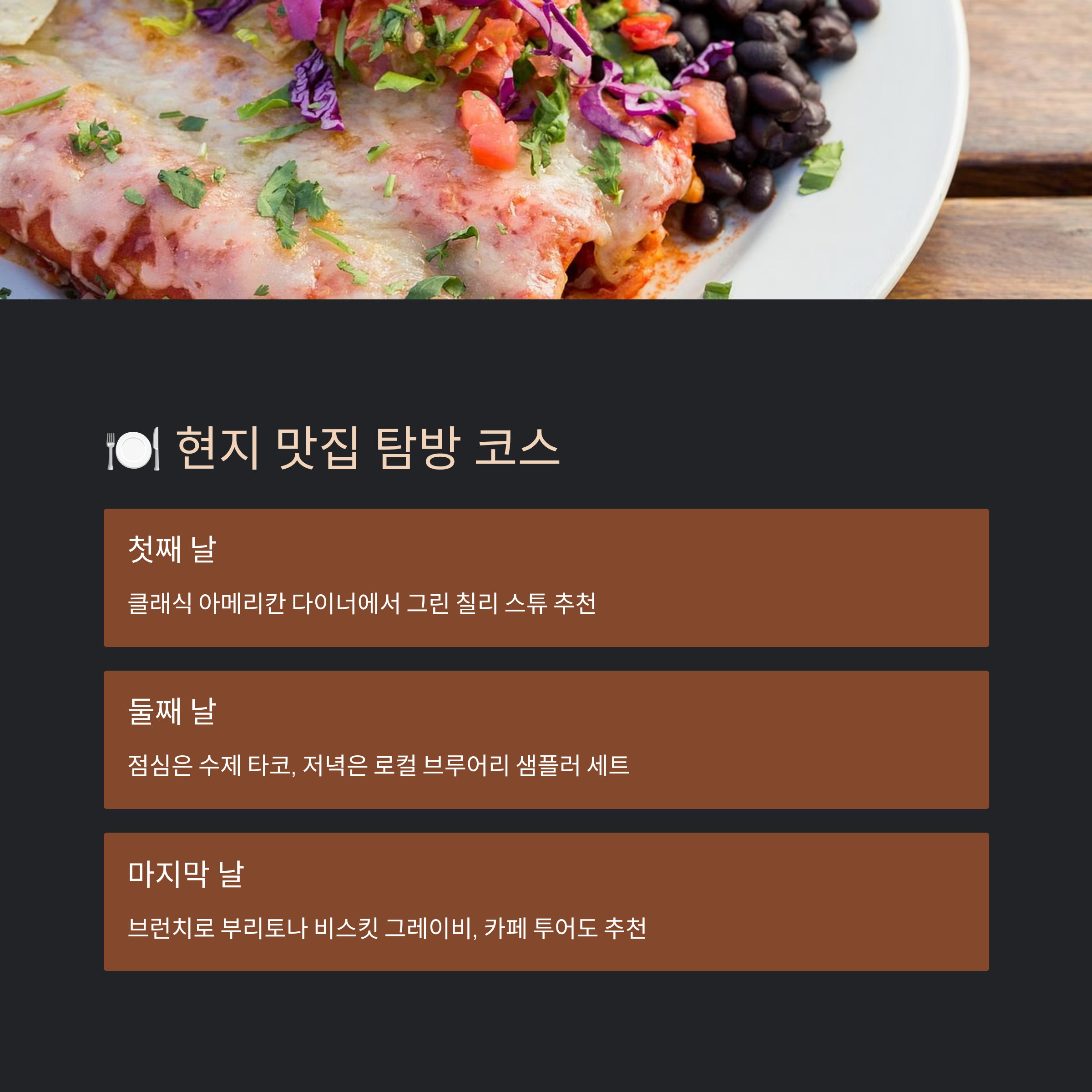 음식은 도시 분위기를 가장 빨리 이해하는 방법이에요. 첫째 날 저녁엔 클래식한 아메리칸 다이너를, 둘째 날 점심엔 수제 타코 전문점을 추천해요. 메뉴판을 보면 생소한 재료가 많아 보일 수 있는데, 직원에게 매운 정도와 추천 소스를 물어보면 친절하게 골라 줍니다. 모르면 헷갈릴 수밖에 없어요, 그래서 더 편하게 물어보는 게 이득이에요.