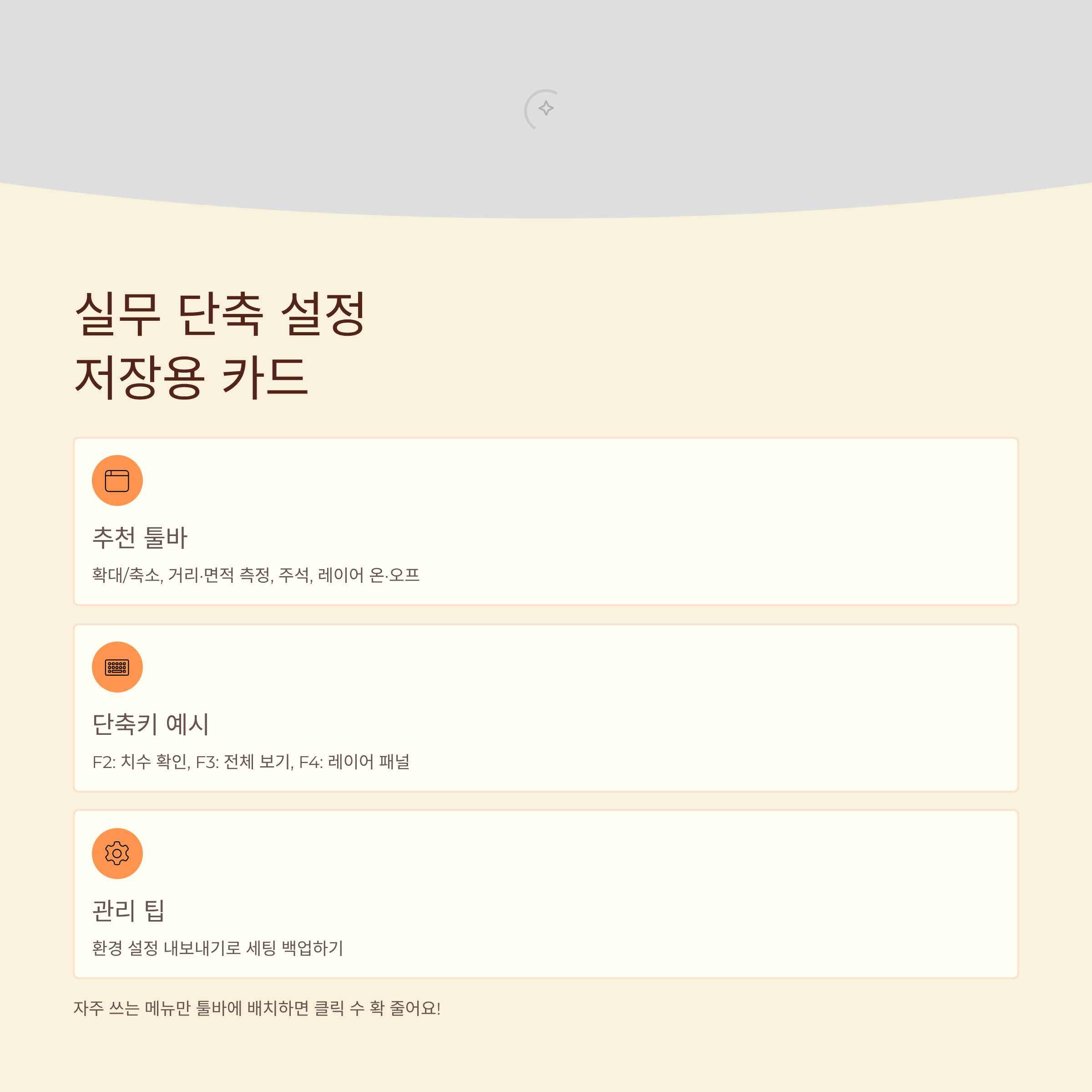 실무에서는 모든 기능을 다 쓰기보다는, 자주 쓰는 메뉴 몇 가지만 손에 익히는 게 훨씬 효율적이에요. 예를 들어 거리 측정, 면적 계산, 주석 달기 같은 기능만 따로 툴바에 빼놓고 쓰면 클릭 수가 확 줄어들거든요. 이런 설정을 한 번만 해두면 다른 프로젝트를 할 때도 그대로 활용할 수 있어서 편해요.