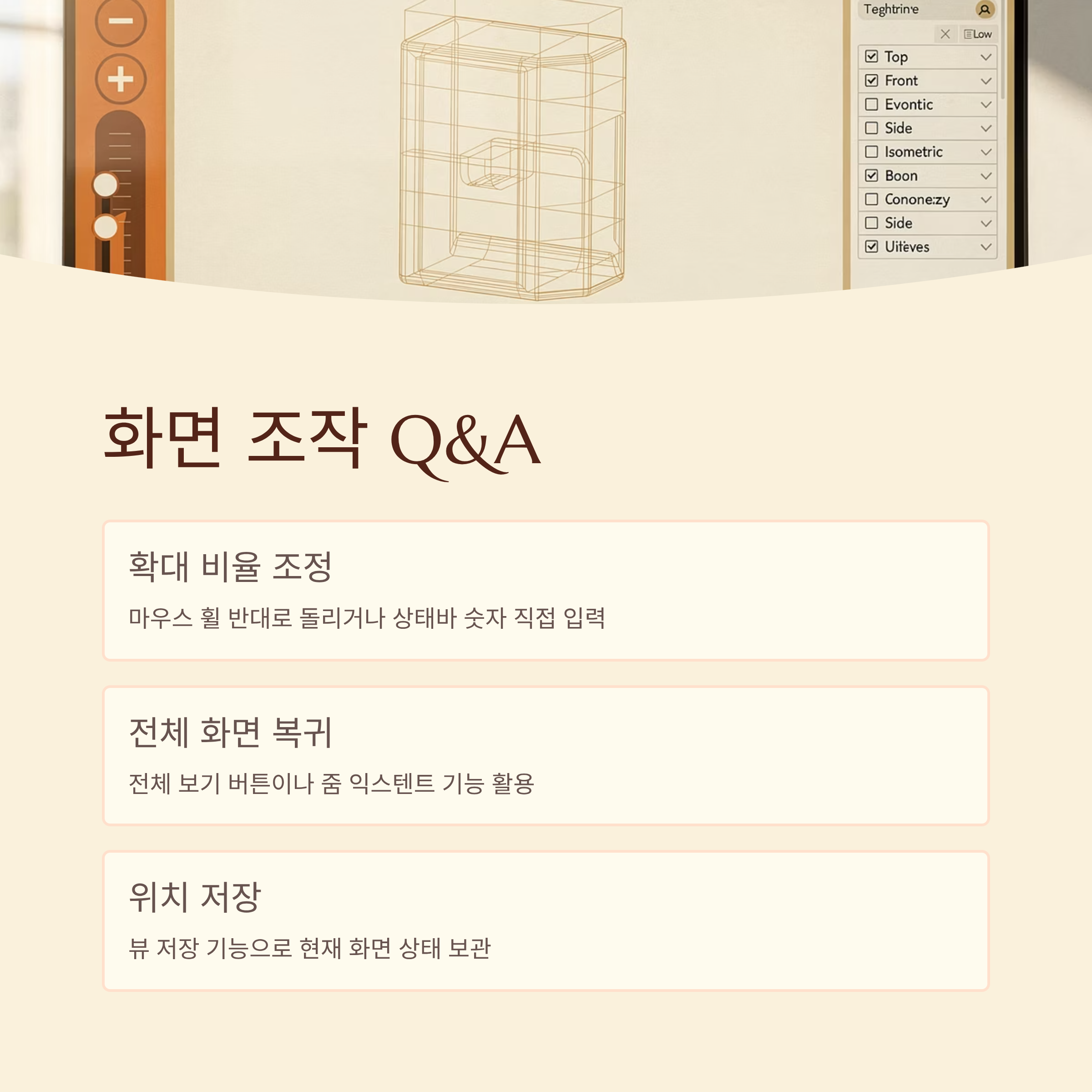 | Q. 원래 화면으로 바로 돌아가는 기능도 있나요? | A. 전체 보기 버튼이나 줌 익스텐트 기능을 누르면 한 번에 전체 도면을 다시 볼 수 있어요. |