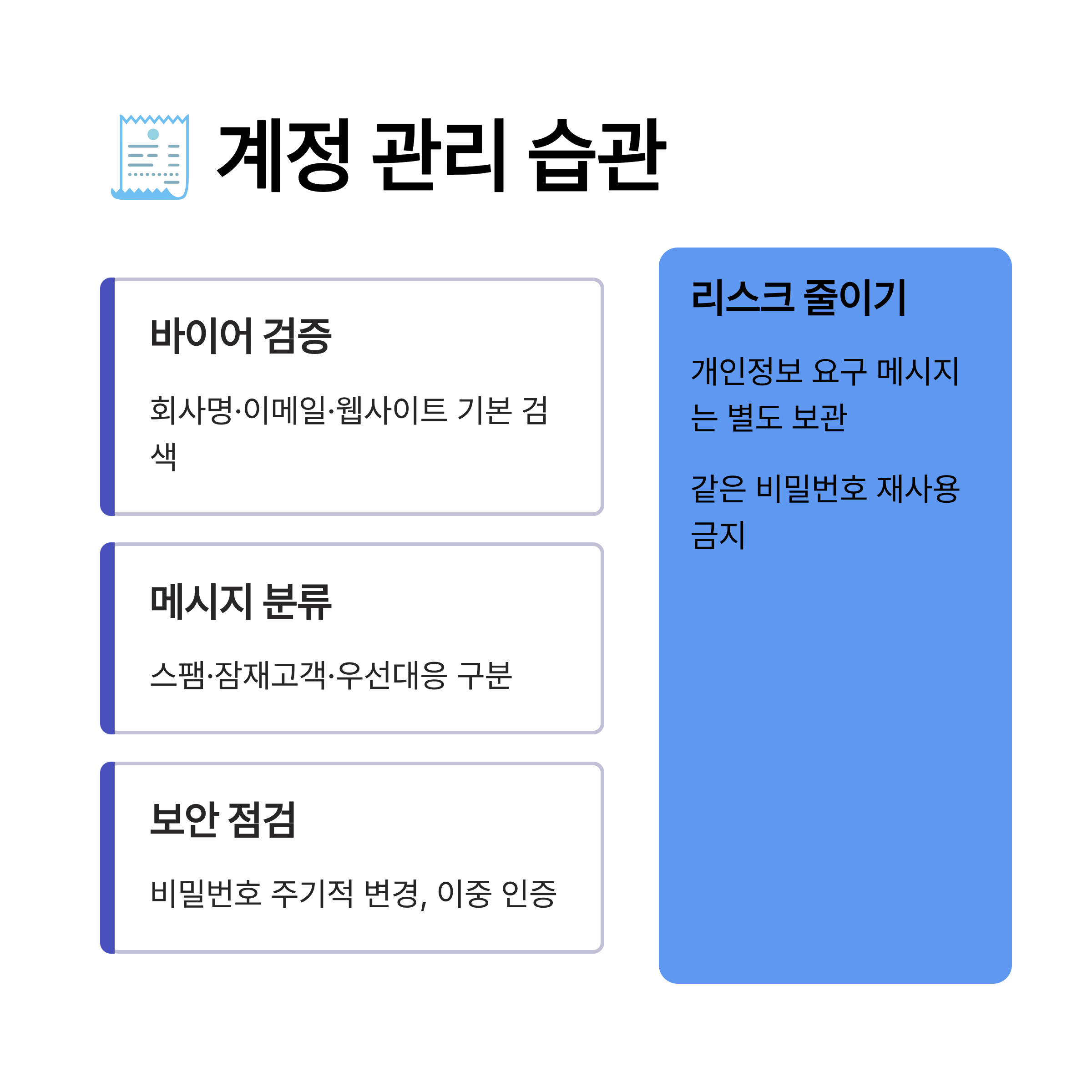 먼저 연락이 온 업체 이름과 이메일 주소를 검색해 보는 습관을 들여 보세요. 기본적인 홈페이지나 회사 정보가 전혀 나오지 않는다면 한 번쯤 의심해 보는 게 좋아요. 또, 처음부터 은행 계좌 정보나 개인 정보를 요구하는 메시지는 바로 거래로 이어지지 않더라도 보관함에 별도로 모아 두고, 나중에 패턴을 파악하는 데 활용해 볼 수 있어요.