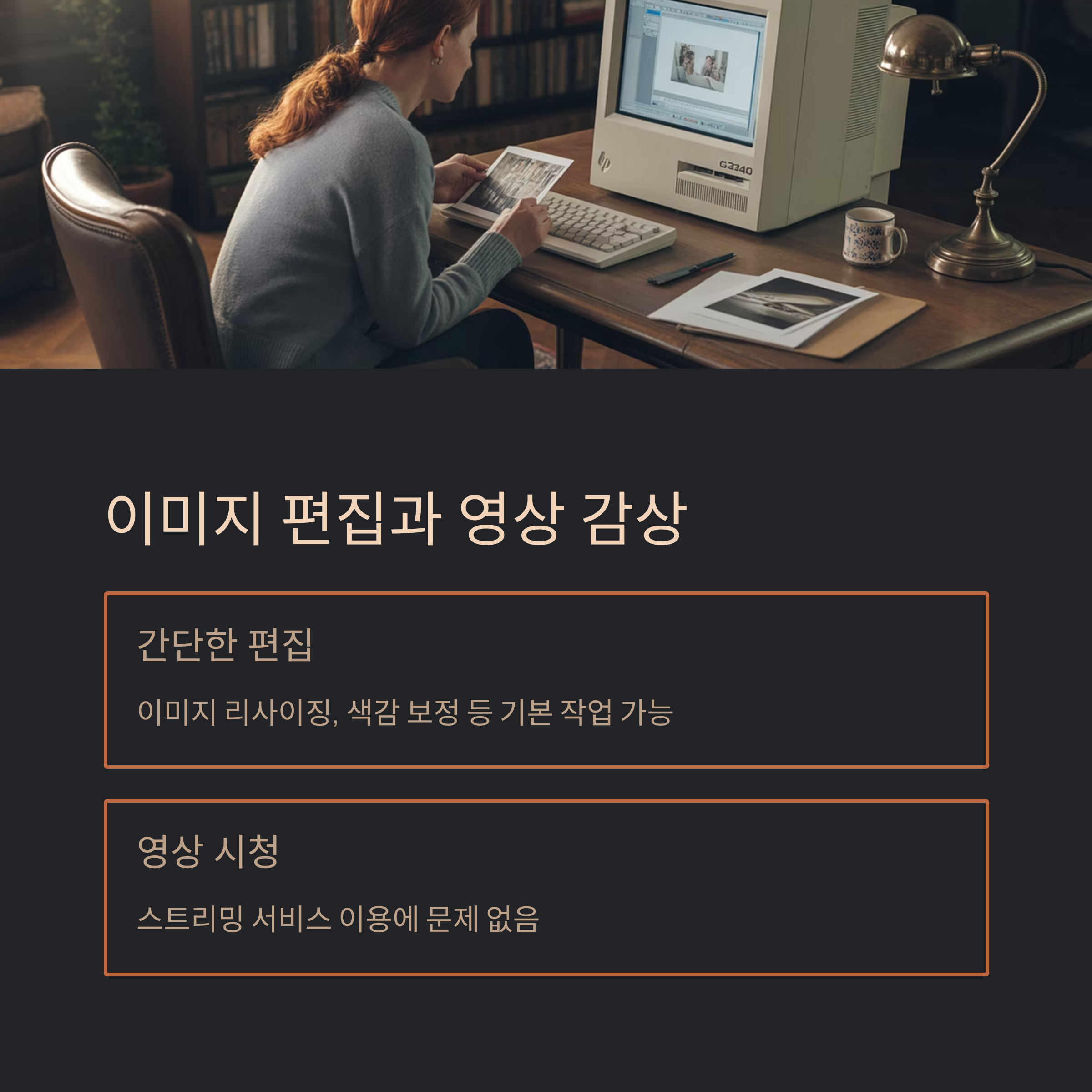 간단한 이미지 리사이징, 색감 보정 같은 정도는 무리 없이 진행할 수 있고, 일부 저사양 영상 편집 프로그램도 기본 컷 편집 정도까지는 감당해줍니다. 물론 고해상도나 다중 트랙을 다루기에는 힘들지만, 초보자나 취미용으로 접근하는 분들에게는 부담 없는 시작점이 될 수 있어요.