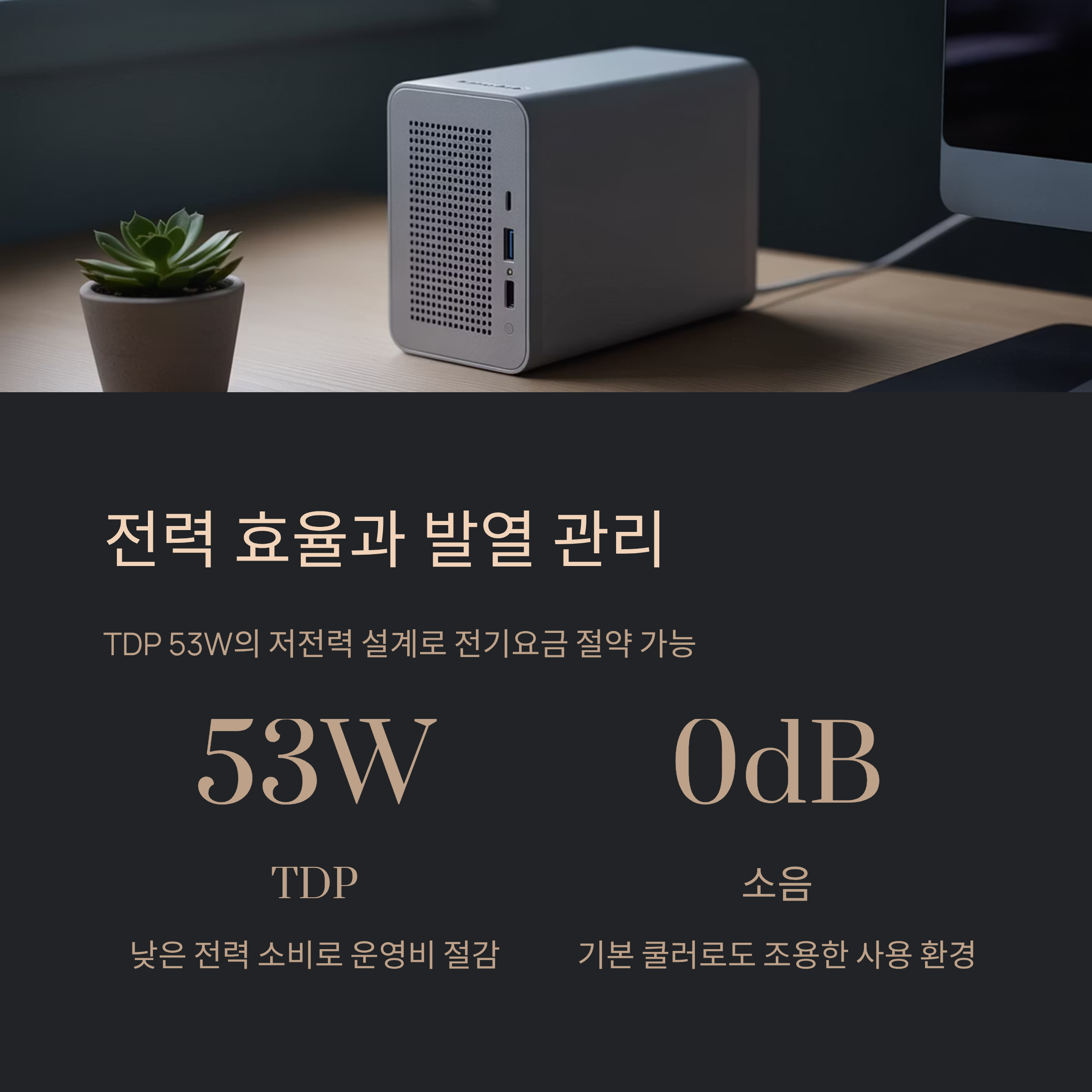 전력 소모가 낮은 시스템은 운영비 측면에서도 유리하죠. 이 제품은 기본 TDP가 53W 수준으로 상당히 효율적인 편이에요. 일반적인 인터넷 사용이나 문서 작업을 장시간 해도 소비 전력이 크지 않아, 전기 요금을 아끼려는 분들에게도 적합해요.