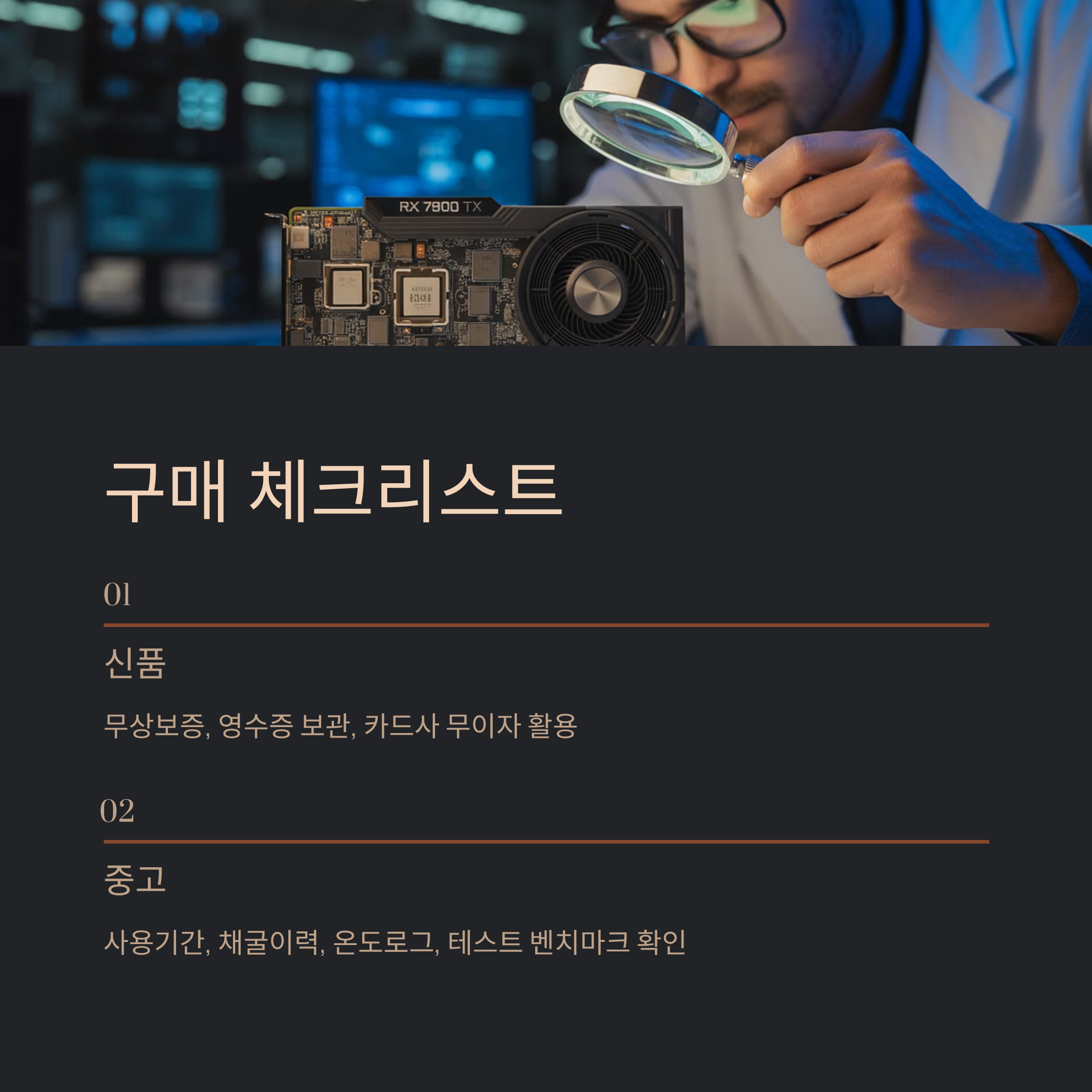 그리고 중고로 되팔 계획이 있다면 박스와 구성품을 잘 보관하고, 사용 기록을 간단히 남겨두세요. 쿨러 세척 주기, 써멀 교체 시점, 전력 제한 프로필 같은 정보가 있으면 판매가가 더 잘 나와요. 이렇게 생애주기를 계획해 두면, 마지막에 남는 건 편안한 사용 경험과 관리 노하우예요. 이것만 알아도 훨씬 수월해져요. 새로 장만한 카드가 오래도록 제 성능을 내주게 됩니다.