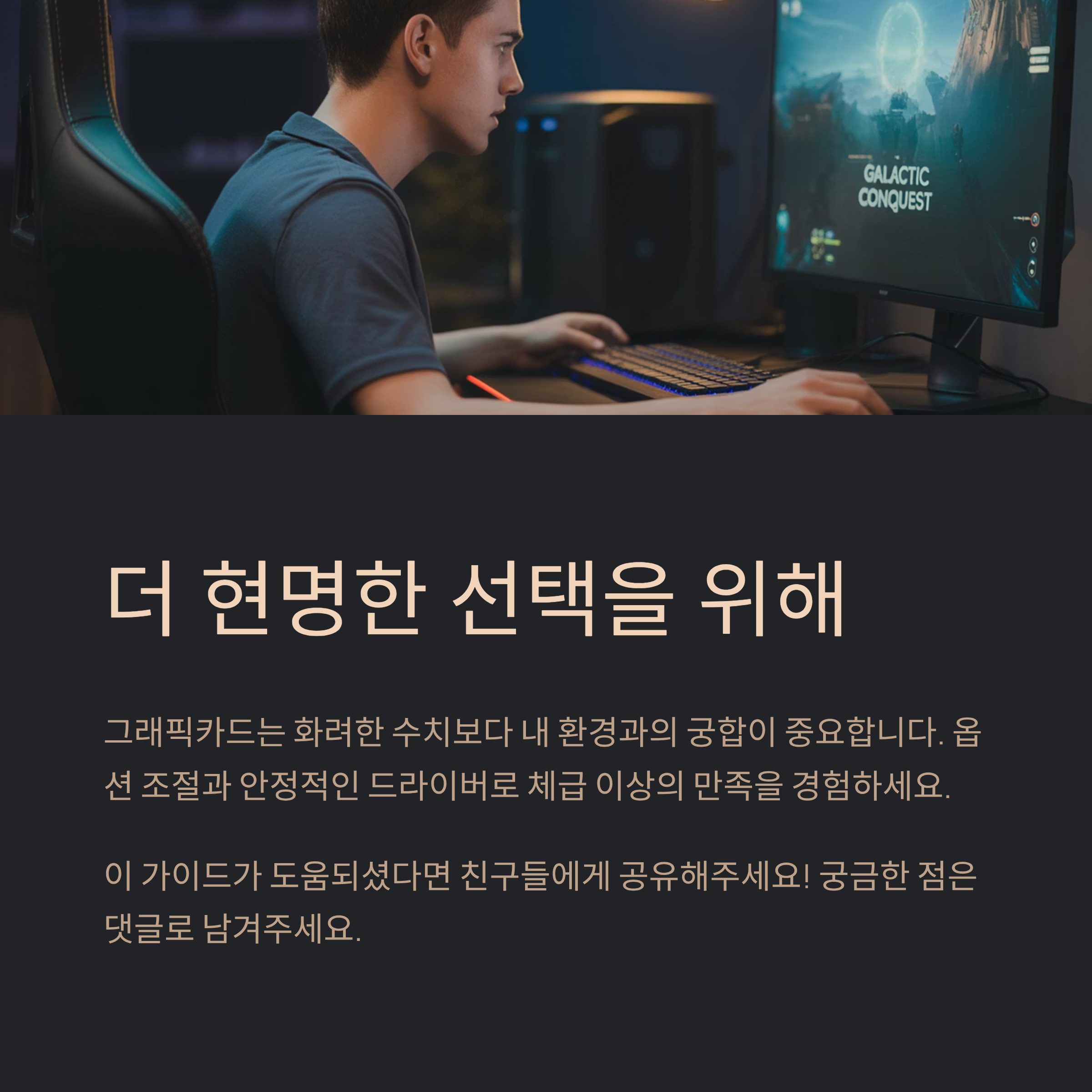 그래픽카드 선택은 화려한 수치보다는 생활 환경과의 궁합을 맞추는 과정에 가까워요. 내 모니터, 파워, 케이스, 즐기는 게임만 놓고 보면 길이 선명해져요. 옵션을 조금만 다듬고 드라이버를 안정적인 버전으로 고정하면 체급 이상의 만족을 주는 순간이 찾아오고요. 장비가 나를 끌고 다니기보다, 내가 장비를 이해하고 길들이는 느낌을 한 번 경험해 보셨으면 해요. 다음 업그레이드 때도 오늘 만든 체크리스트가 조용히 길을 잡아줄 거예요. 천천히, 하지만 정확하게 선택해 보세요. 여러분의 주말이 더 즐겁고 가벼워지길 응원해요.