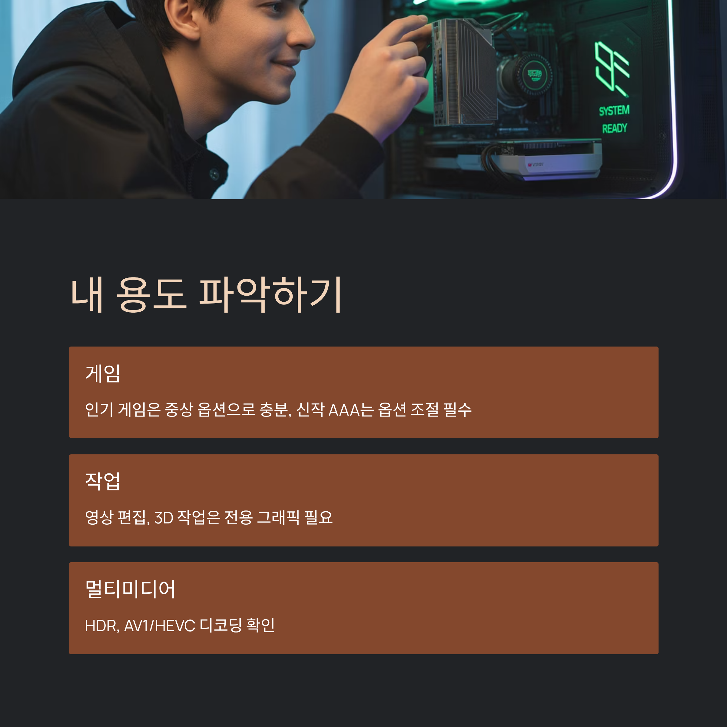 멀티미디어만 본다면 유튜브·OTT HDR 재생, AV1/HEVC 디코딩 같은 편의 기능도 확인해요. 오래된 모니터를 쓰면 케이블 규격이 발목을 잡을 수 있으니 DP/HDMI 버전도 점검해 두고요. 외부 전원 커넥터(6핀/8핀) 존재 여부와 케이스 길이 제한까지 체크하면 장착 당일에 당황할 일이 없어요. 이렇게 용도를 먼저 분해해 보면, 알고 보니까 별거 아니었어요 싶은 결론이 나올 때가 많아요.
