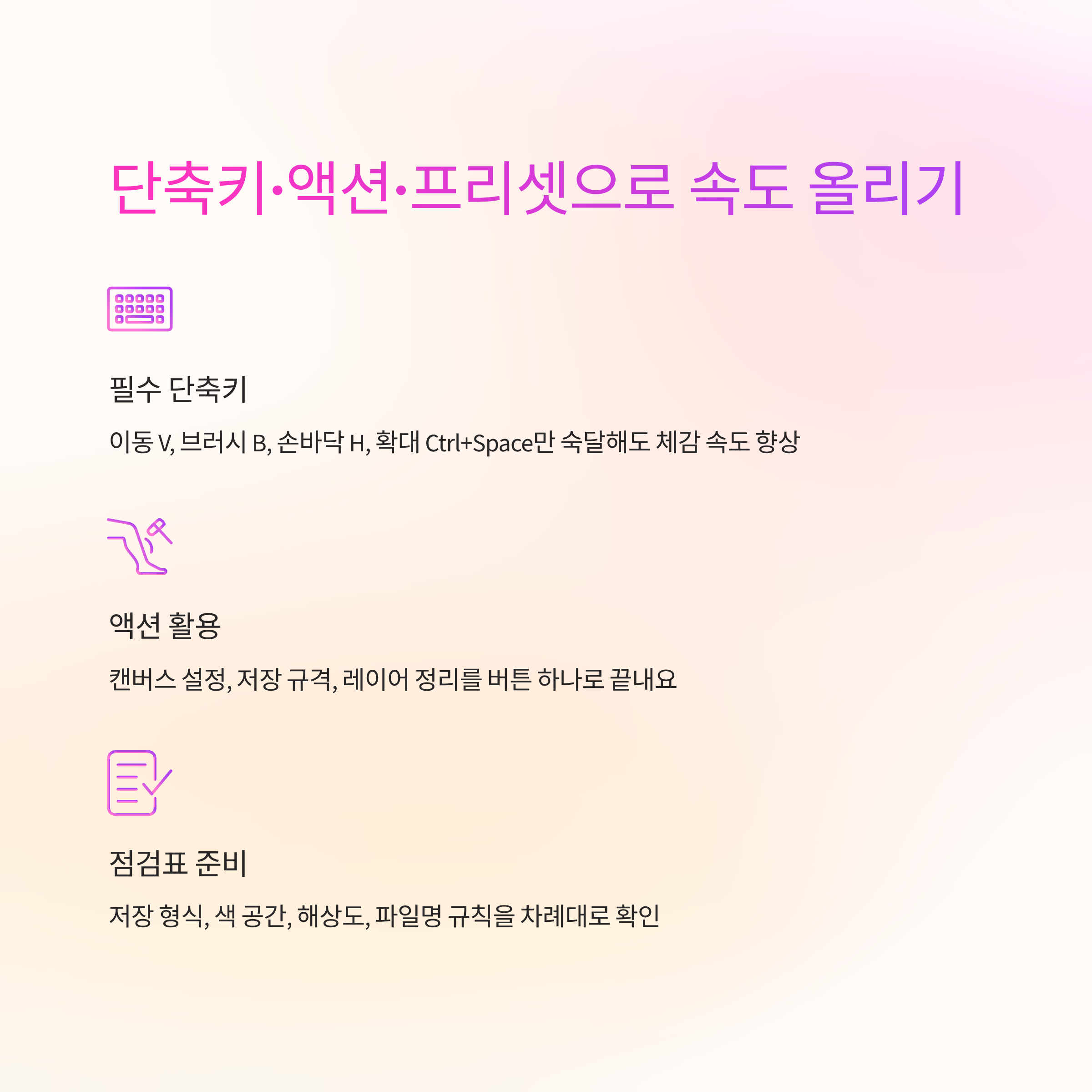 액션에는 캔버스 설정, 저장 규격, 레이어 정리 세 가지를 넣어두세요. 새 문서 만들기부터 저장까지 버튼 한 번으로 끝나면 손이 크게 줄어요. 브러시·그라디언트·색상표는 시험용 세트를 따로 만들어 헷갈림을 줄여요.