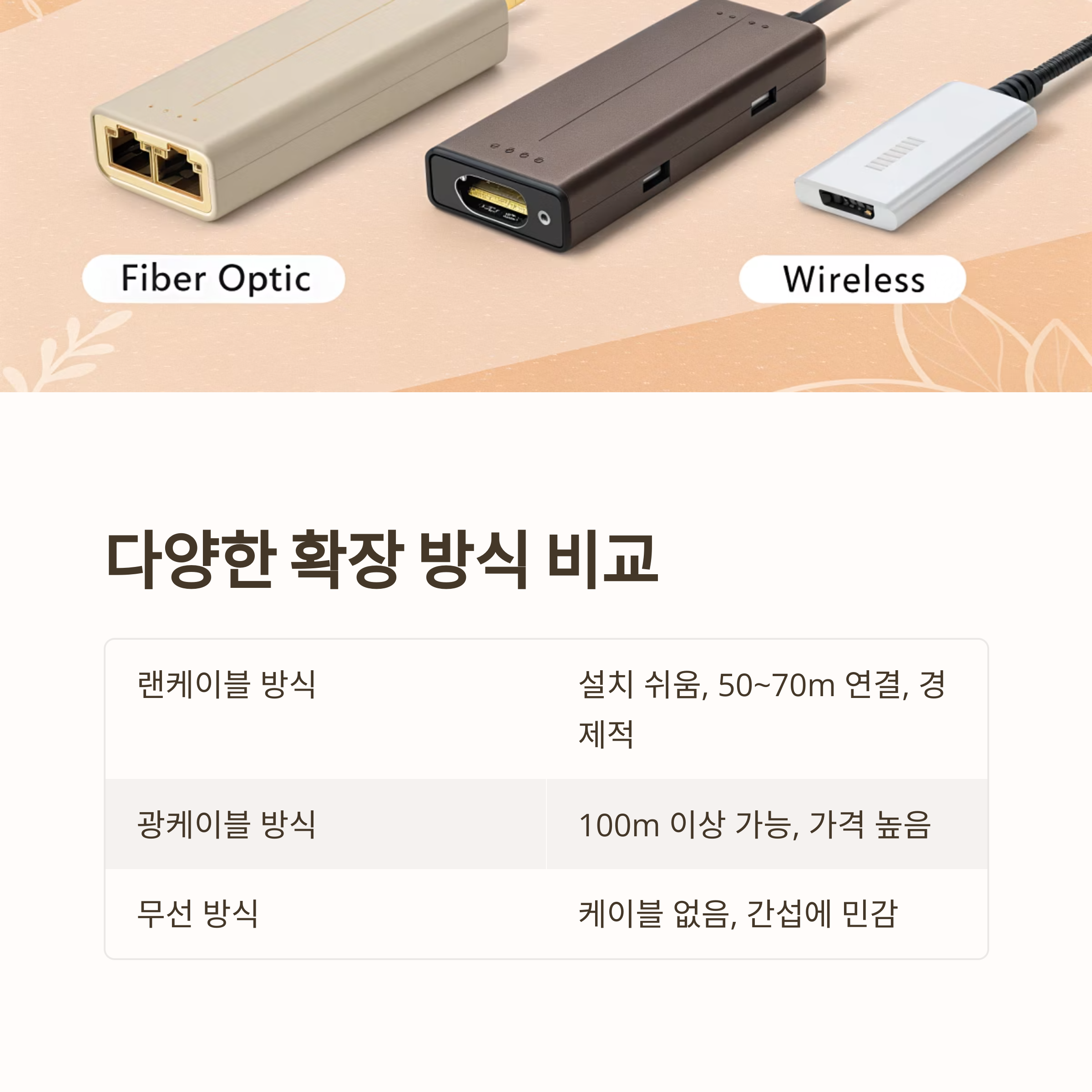 랜케이블 방식은 설치가 쉬우면서도 최대 50~70m까지 커버할 수 있어 많이 사용돼요. 광케이블 방식은 100m 이상 장거리 연결도 가능하지만, 장비 가격이 비교적 높아요. 무선 타입은 케이블 배선이 불가능한 곳에 적합하지만, 간섭에 민감해요.