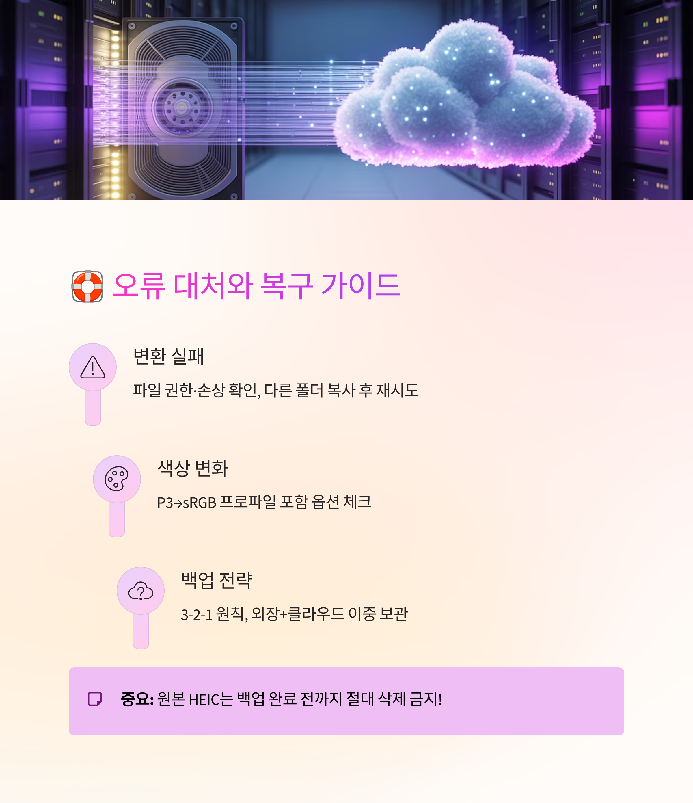 변환이 실패하면 파일 권한이나 손상 여부부터 봐요. 다른 폴더로 복사 후 시도하거나, 미리보기로 열어 저장만 다시 해도 복구되는 경우가 많아요. 썸네일이 안 보이면 캐시를 지우고, 외장 디스크는 exFAT처럼 호환성 높은 포맷을 쓰면 전송 에러가 줄어요.